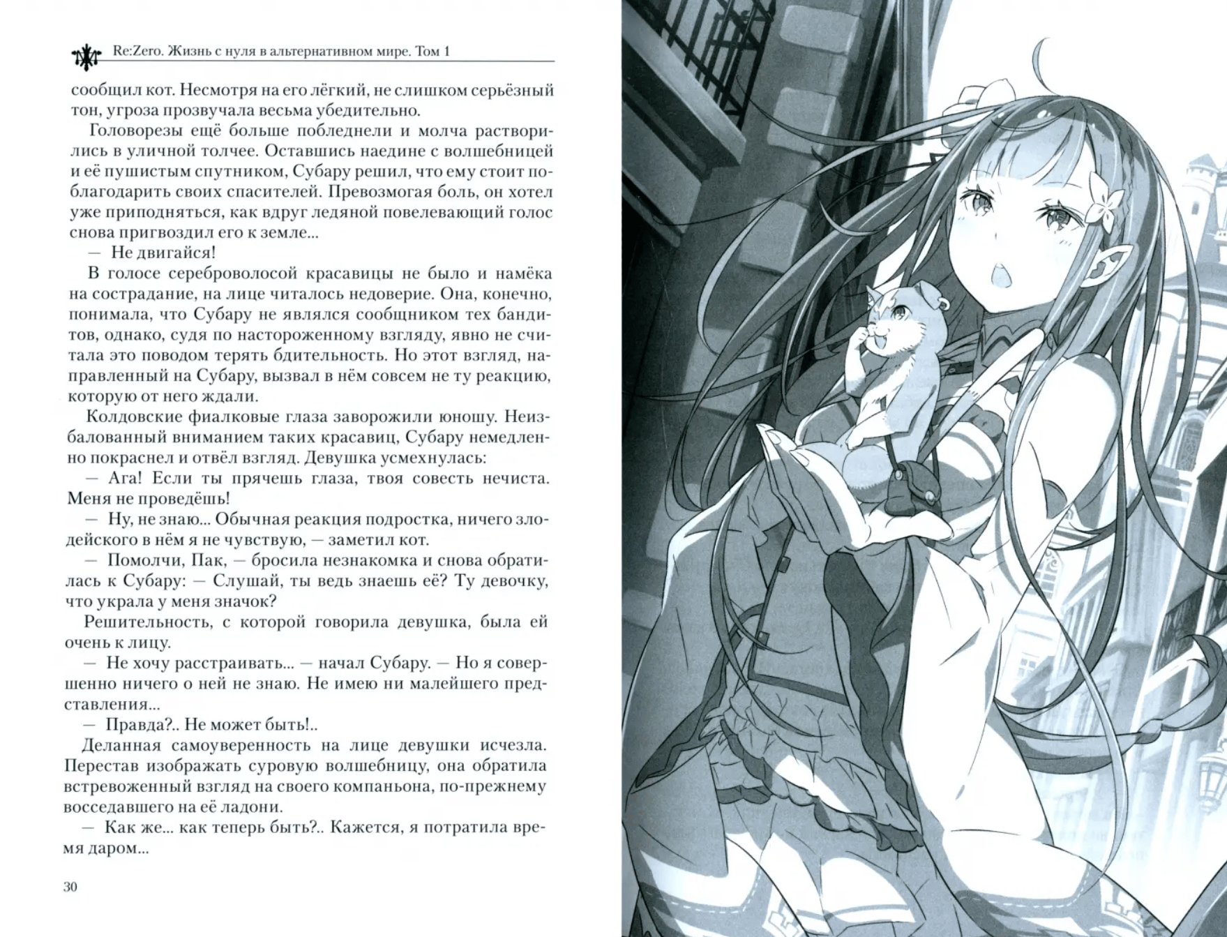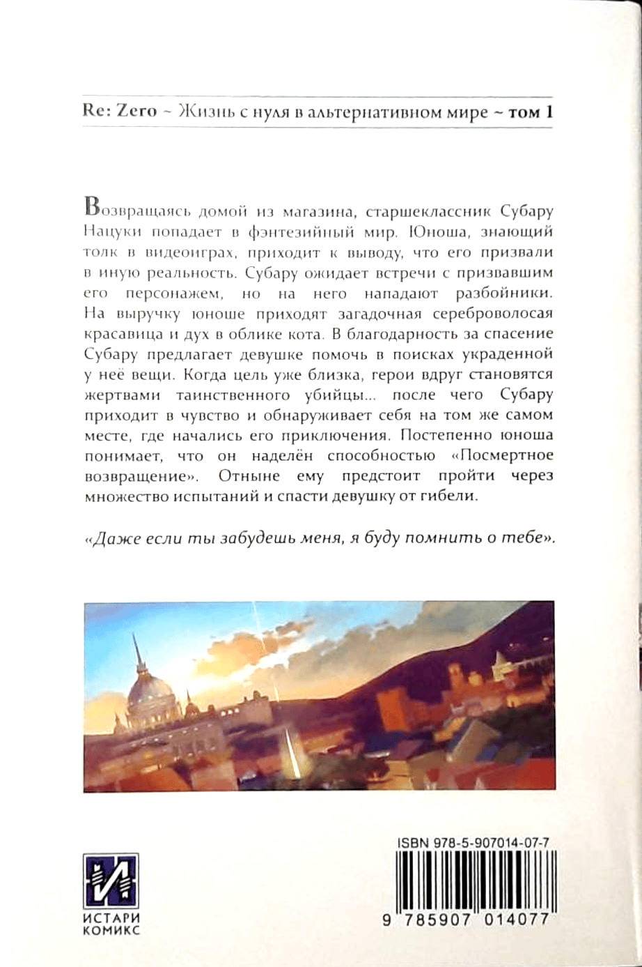 In the book Re: Zero Life from scratch in an alternative world, high school student Subaru Natsuki finds himself in a fantasy world while returning home from the store. The young man, who knows a lot about video games, comes to the conclusion that he was summoned to another reality. Subaru expects to meet the character who summoned him, but he is attacked by bandits. A mysterious silver-haired beauty and a spirit in the form of a cat come to the rescue of the young man. In gratitude for saving him, Subaru offers to help the girl find the thing she stole from her. When the goal is already close, the heroes suddenly become victims of a mysterious killer ... after which Subaru comes to his senses and finds himself in the same place where his adventures began. Gradually, the young man realizes that he is endowed with the ability "Return after death". From now on, he will have to go through many trials and save the girl from death. "Even if you forget me, I will remember you."