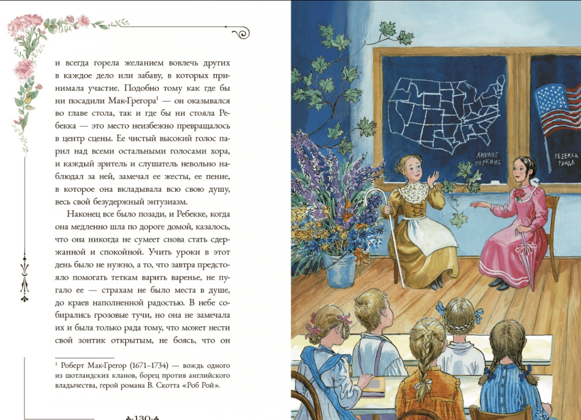Kate Douglas Wiggin (1859-1823) was an American novelist, author of novels, the most famous of which was "Rebecca of Sunny Creek Farm", written in 1903. The book was enthusiastically received by readers and critics, translated into foreign languages and was the basis of a theatrical production, which was also a huge success. In American schools created clubs named after Kate Wiggin, in which the writer read excerpts from her works, in recognition of her awarded a doctorate in literature. The story is printed in a wonderful translation by Marina Batischeva with illustrations by contemporary artist Anna Petrova, made especially for this edition.