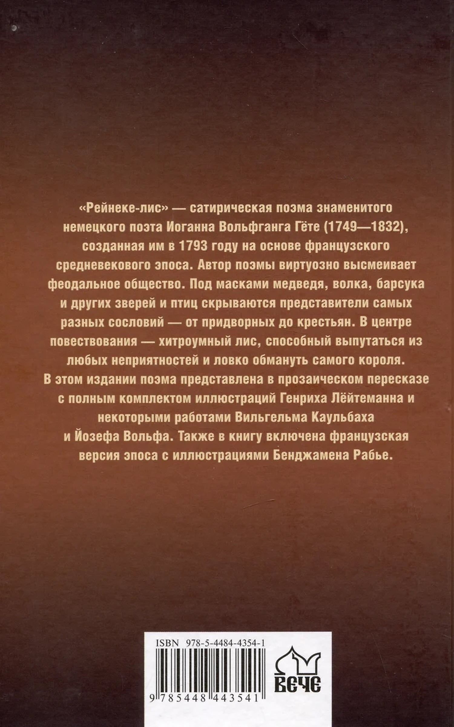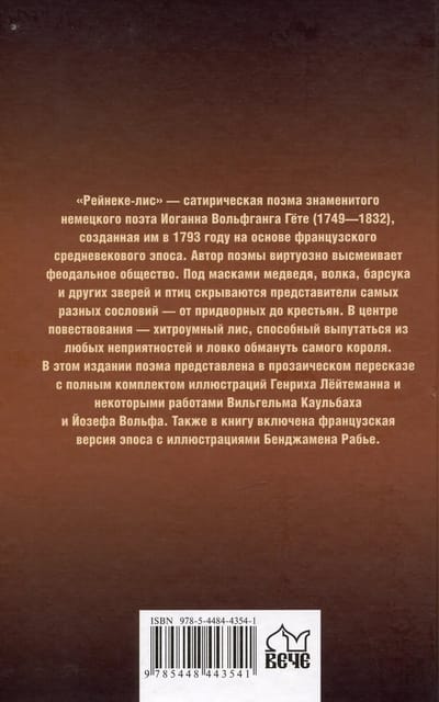 "Reynard the Fox" is a satirical poem by the famous German poet Johann Wolfgang von Goethe (1749–1832), created in 1793 based on a French medieval epic. The author of the poem masterfully ridicules feudal society. Representatives of various classes, from courtiers to peasants, hide under the masks of a bear, a wolf, a badger and other animals and birds. At the center of the story is a cunning fox who is able to get out of any trouble and cleverly deceive the king himself.