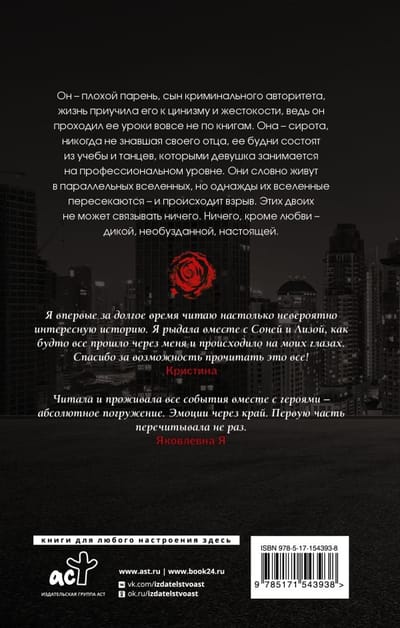 He is a bad guy, the son of a criminal authority, life has accustomed him to cynicism and cruelty, because he passed her lessons not at all from books. She is an orphan who has never known her father, her everyday life consists of studying and dancing, which she does professionally. It is as if they live in parallel universes, but one day their universes intersect - and there is an explosion. Nothing can bind these two. Nothing but love - wild, unbridled, real love.