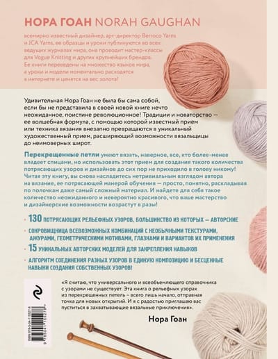 Nora Goan is creating another revolution in knitting! This extraordinary world-class master, a "rock star" in the world of knitting, has such a wild imagination and a non-trivial view on the creation of knitted things that doing something incredible, amazing, innovative for her in the order of things! 130 patterns, 15 author's models and an incalculable number of combinations - all this fits into her new book! Best of all, it's all from crossed loops that even a beginner can knit. Textures, eyes, geometric motifs - an ordinary technique in Nora's hands suddenly turns into a unique means of artistic expression. Stunning relief motifs appearing on the knitted fabric are not only easy to knit, they surprisingly expand the design potential of any master. And Nora Goan also knows how to teach the slender theory in such a way that you'll have a unique tool for creating your own patterns and designs. "This book is just a beginning, a starting point for new discoveries. And I am happy to invite you to embark on an exciting knitting adventure" Nora Goan