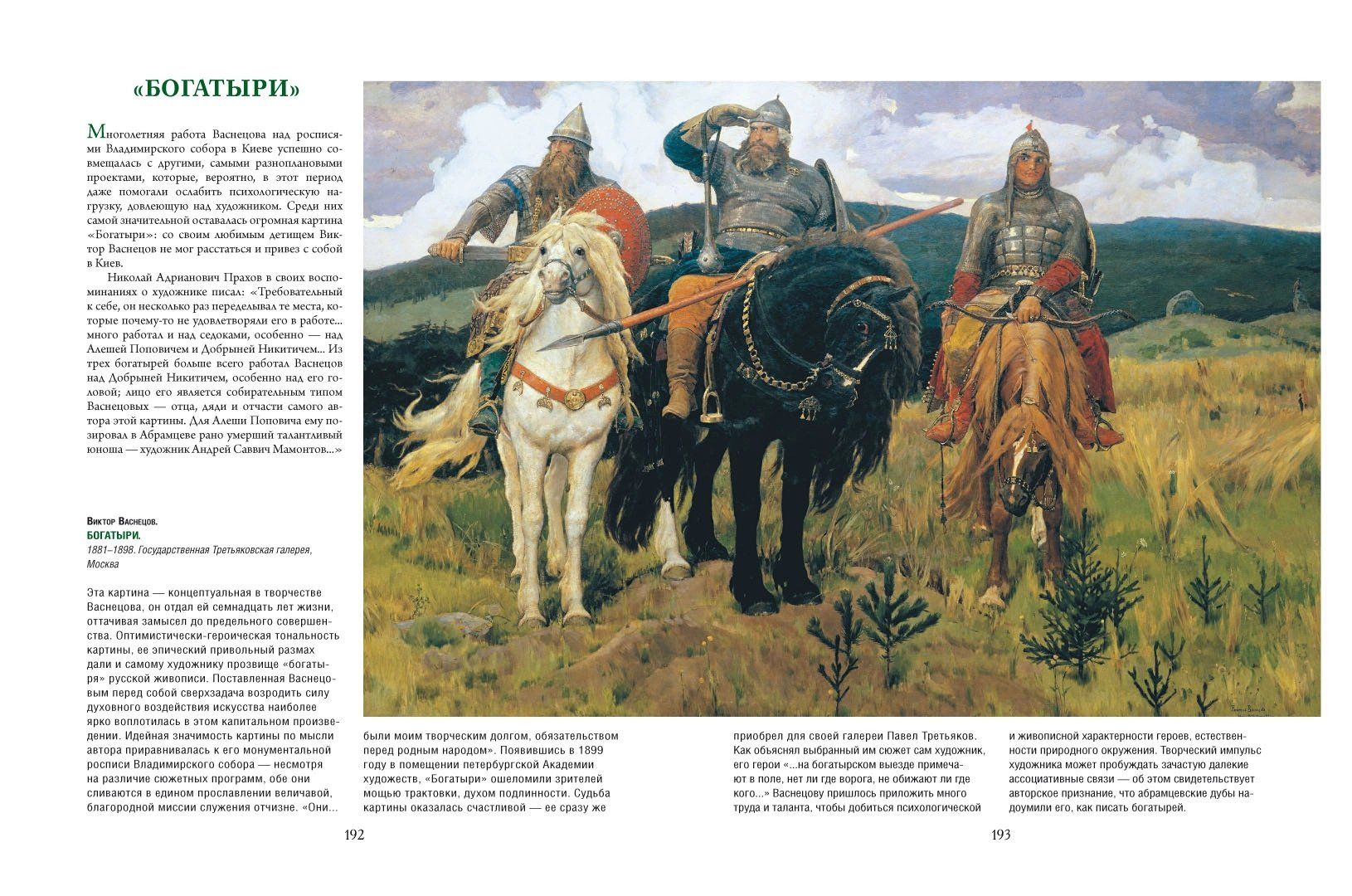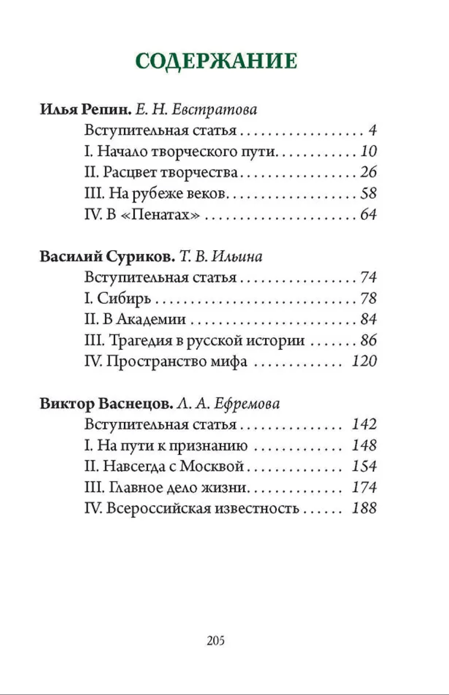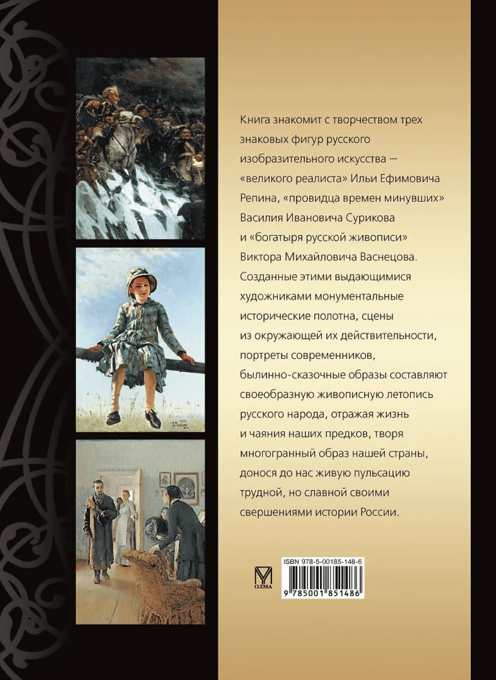 This book introduces the work of three iconic figures in Russian fine art: the "great realist" Ilya Efimovich Repin, the "seer of bygone times" Vasily Ivanovich Surikov, and the "hero of Russian painting" Viktor Mikhailovich Vasnetsov. The monumental historical canvases, scenes from the reality surrounding them, portraits of contemporaries, and epic-fairytale images created by these outstanding artists constitute a unique pictorial chronicle of the Russian people, reflecting the lives and aspirations of our ancestors, creating a multifaceted image of our country, and conveying to us the living pulse of Russia's difficult yet glorious history.