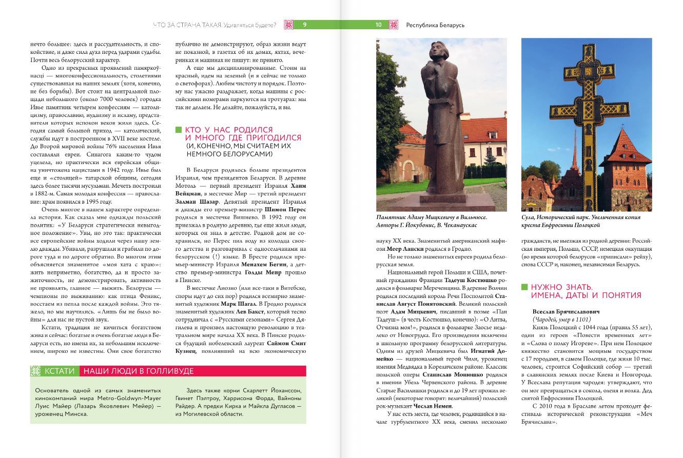 We invite you to join the author on a stroll through Belovezhskaya Pushcha, explore the Kalozha Church in Grodno, visit the Upper Town in Minsk, climb to the observation deck of Vitebsk Town Hall, and learn about the Rumyantsev and Paskevich Palaces in Gomel. Ancient Catholic churches, fortified churches, and palaces, trails through protected forests, and eco-trails in swamps—all of this attracts tourists to Belarus. Read about the most delicious, the most mysterious, and the most beautiful.
