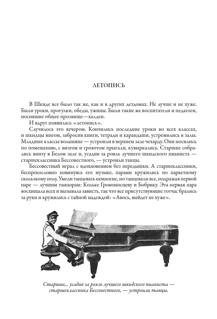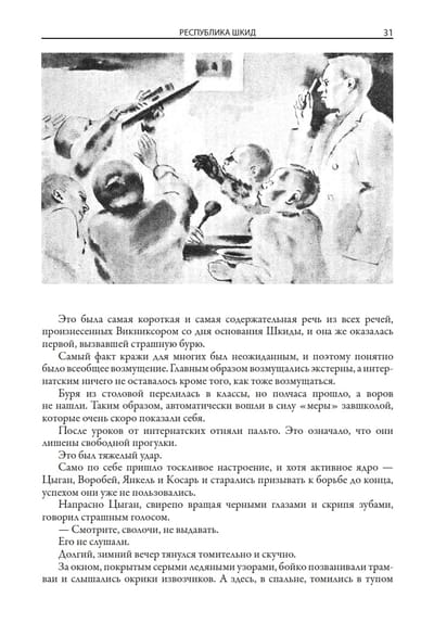 The adventure story "The Republic of Shkid" about the life of street children in the Dostoevsky School-Commune (Shkid) was first published in 1927. Its authors - Grigory Belykh and Alexei Yeremeev (who wrote under the pseudonym A. Panteleyev) - were familiar with this topic firsthand. They themselves were as children homeless, so the story written by them has a partly autobiographical character. The fate of the authors turned out differently. Both became journalists, but Belykh died of tuberculosis in 1938, and Eremeev lived a long life, having managed to write many stories and fairy tales for children. He often returned in his work to the "Shkid" theme. It would seem that the problem of homelessness, so relevant in the early years after the revolution, has long gone into the past, but the reader's interest in "The Republic of Shkid" does not fade. The secret of the success of the story is that it tells not only about a difficult childhood, but also about human relationships, about the problems of socialization, about the formation in the soul of a small man corrosive concepts such as "conscience", "responsibility" and "duty", about the behavior of a child in a difficult life situation, about his search for his place in the adult world. These themes are eternal, they do not lose their relevance in our days. It is also important that the story is written cheerfully, with humor, it has many mischievous adventures. It is no coincidence that "The Republic of Shkid" was repeatedly reprinted and translated. The book is decorated with illustrations by Nikolai Andreevich Tyrsa (1887-1942), one of the founders of the Leningrad school of book graphics. He was taught the subtleties of craftsmanship by such coryphees of painting as Bakst and Dobuzhinsky. Nikolai Andreevich's creative interests were quite diverse. He was fond of studying Old Russian art, engaged in decorative painting of St. Petersburg mansions and industrial design, taught watercolor technique to students, but still the main love of his life was book illustrations. Tyrsa started doing them in the 20s of the last century. Before the war, he designed many books by Boris Zhitkov, drew illustrations for Pushkin's "Queen of Spades", Tolstoy's "Anna Karenina" and Lermontov's "The Hero of Our Time". Speaking about his illustrations for "The Republic of Shkid", L. Panteleev noted: "This is a very accurate realistic drawing with a subtle shade of grotesque. In short, it is the style of the story itself ... Shkidtsy drew and after Tyrsa - and at home and abroad, and no one has ever managed so faithfully, so easily, cheerfully and victoriously to capture not only the factuality, but also the very spirit of our homeless boyhood republic.