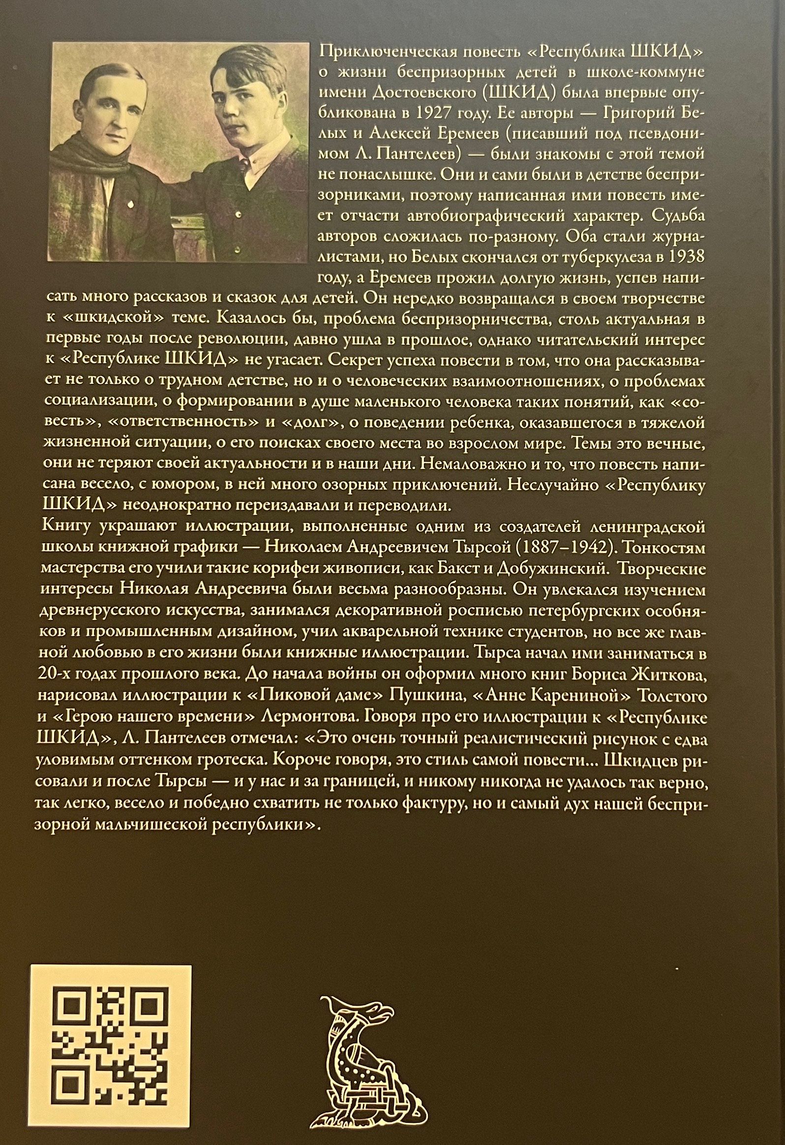 The adventure story "The Republic of Shkid" about the life of street children in the Dostoevsky School-Commune (Shkid) was first published in 1927. Its authors - G. G. Belykh (1906-1938) and A. I. Yeremeev (1908-1987), who wrote under the pseudonym L. Panteleyev - were homeless children themselves, so the story is partly autobiographical in nature. The edition also includes eighteen "shkid" stories by Panteleev and Belykh. The book is decorated with illustrations by the famous graphic artist N. A. Tyrsa (1887-1942).