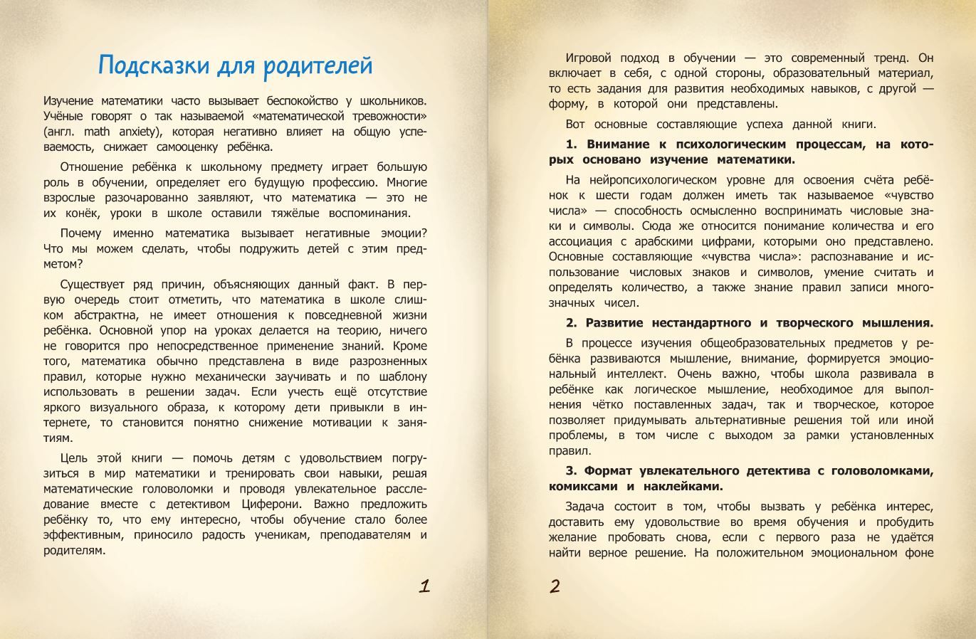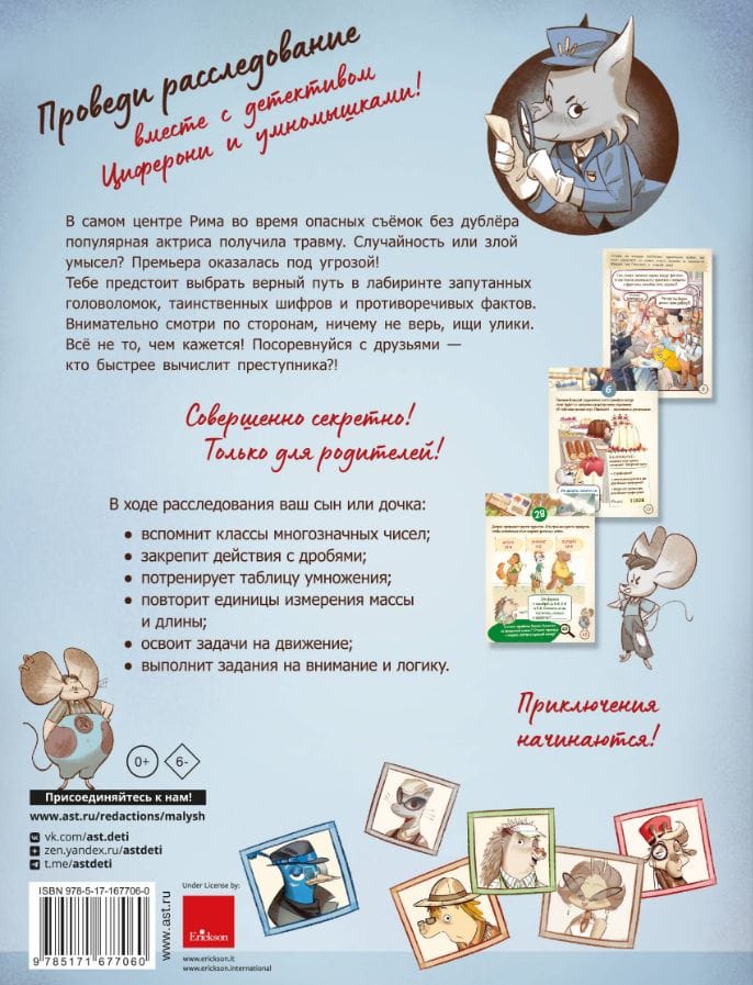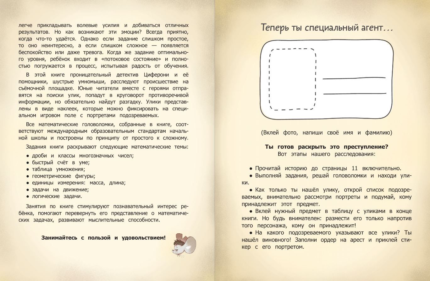 Why do we need mathematics? This question often arises among schoolchildren. A quest book with a detective plot, mathematical puzzles, comics and stickers will help them take a fresh look at school lessons. They will understand that the laws of mathematics surround a person. The search for clues will help children apply their knowledge in practice. They will practice performing arithmetic operations within 1000, repeat the multiplication table, fractions, easily solve logical problems, as well as problems on movement, remember geometric figures and more. As a result, interest in the subject will increase and the barrier of so-called "mathematical anxiety" will be overcome forever.