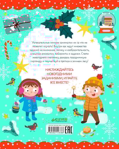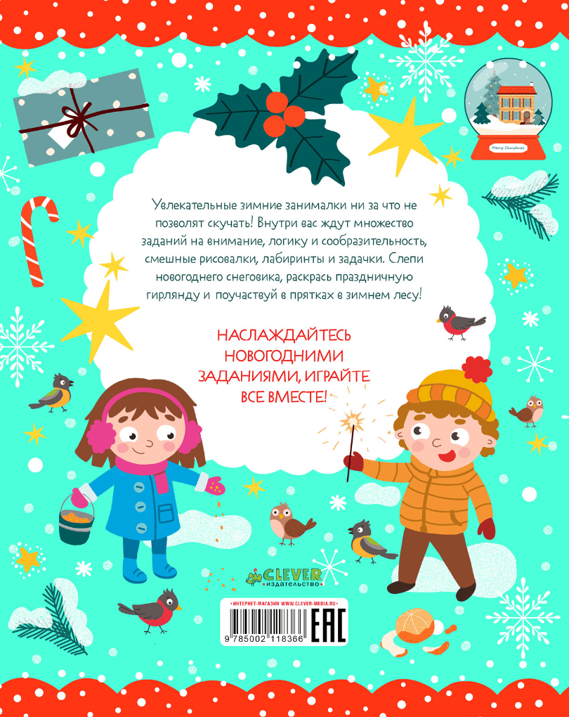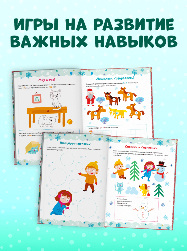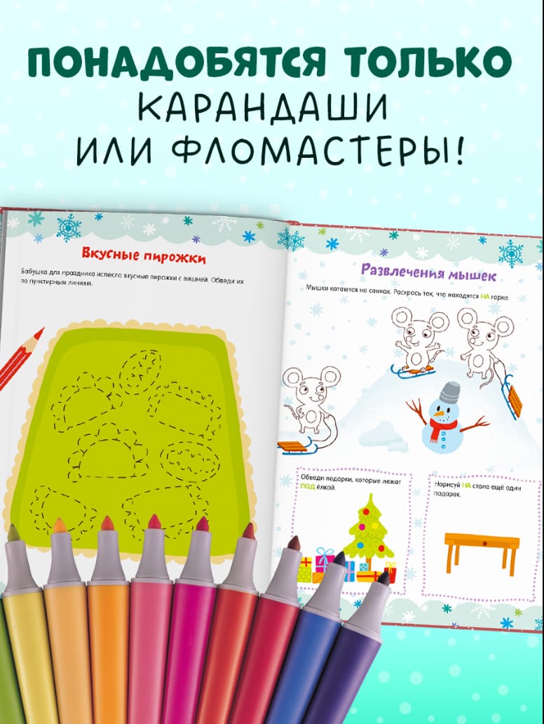 The children went to the village to visit their grandparents, they are preparing to celebrate the New Year, walking and enjoying the winter. And together with them, little readers move from page to page, completing exciting tasks to develop a variety of skills - logic, attention, intelligence. And also familiarization with counting and new concepts. Who is sitting ON the tree, and who is UNDER the bench? How many birds did Masha and Petya feed, which tree is the biggest? Snowmen, Christmas tree decorations, horses for Santa Claus, home decorations ... Coloring, dotted lines, counting, geometric shapes.
