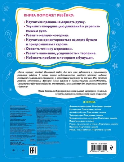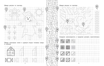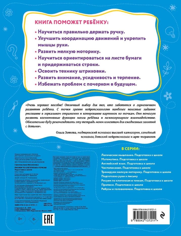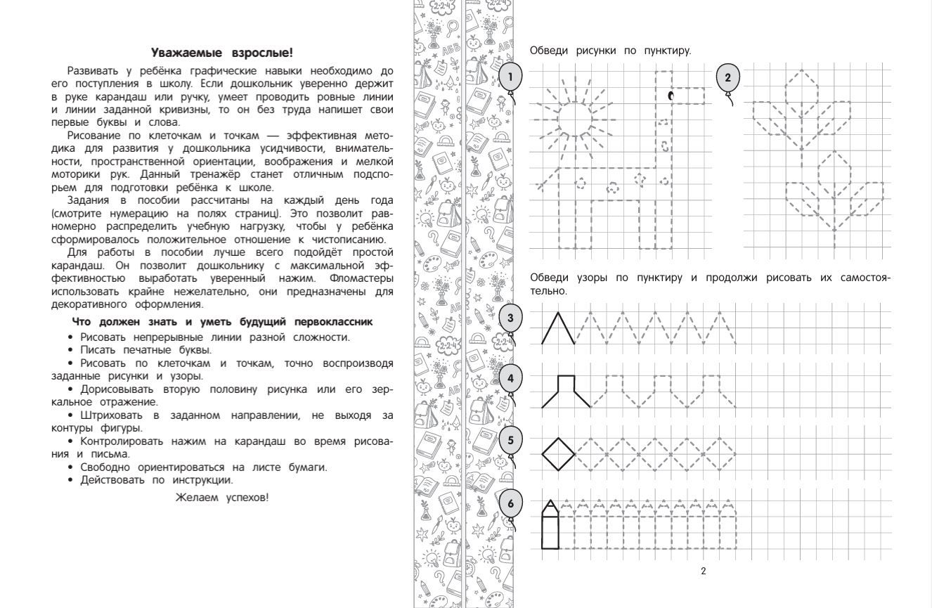 This book for children aged 5 and up will help a preschooler learn to draw on squares and dots, develop fine motor skills and prepare his hand for writing. In the future, this will help him avoid problems with penmanship and become the owner of beautiful handwriting. The workbook contains more than 365 exercises that will help the child learn to draw straight lines, count squares and dots, draw patterns, letter elements, hatch, accurately copy pictures on squares and dots, and come up with new pictures. The exercises are designed for every day of the year. This contributes to the even distribution of the educational and play load and the formation of a positive attitude towards learning in the child. The preschooler will learn to navigate on a sheet of paper, get used to the format of a student's squared notebook, become attentive, neat, independent and acquire other important skills necessary for studying at school.
