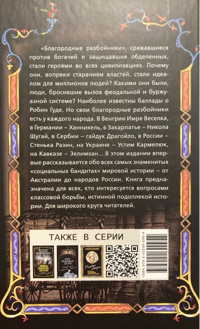 "Noble robbers" who fought against the rich and defended the disadvantaged became heroes in all civilizations. Why, despite the efforts of the authorities, did they become an ideal for millions of people? What were they like, these people who challenged the feudal and bourgeois systems? The most famous are the ballads of Robin Hood. But every nation has its noble robbers. In Hungary, Imre Veselka, in Germany, Hannikel, in Transcarpathia, Nikola Shugai, in Serbia, the haiduk Dragoilo, in Russia, Stenka Razin, in Ukraine, Ustim Karmelyuk, in the Caucasus, Zelimkhan... This book tells for the first time about all the most famous "social bandits" of world history – from Australia to the peoples of Russia. This book is intended for anyone interested in questions of class struggle and the true background of history. It is intended for a wide range of readers.