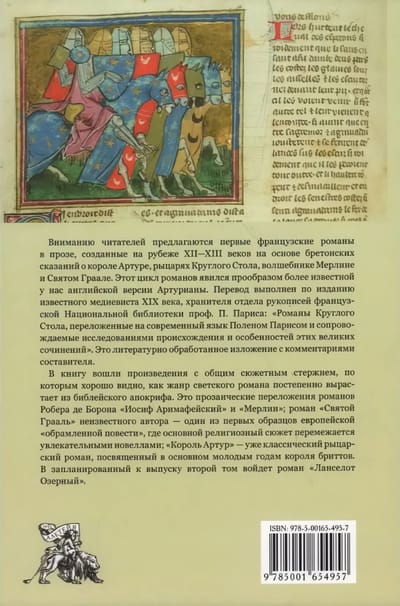 The Breton tales of King Arthur, the Knights of the Round Table and the search for the Holy Grail and the French chivalric novels created on their basis are almost unfamiliar to Russian readers, although they are much older, more complete and diverse than the English version of the Arthuriana known to us. The translation is based on the edition by Prof. P. Paris, a famous medievist of the XIX century, keeper of the manuscripts department of the French National Library: "The Romances of the Round Table, translated into modern language by Polen Paris and accompanied by studies of the origin and peculiarities of these great works".