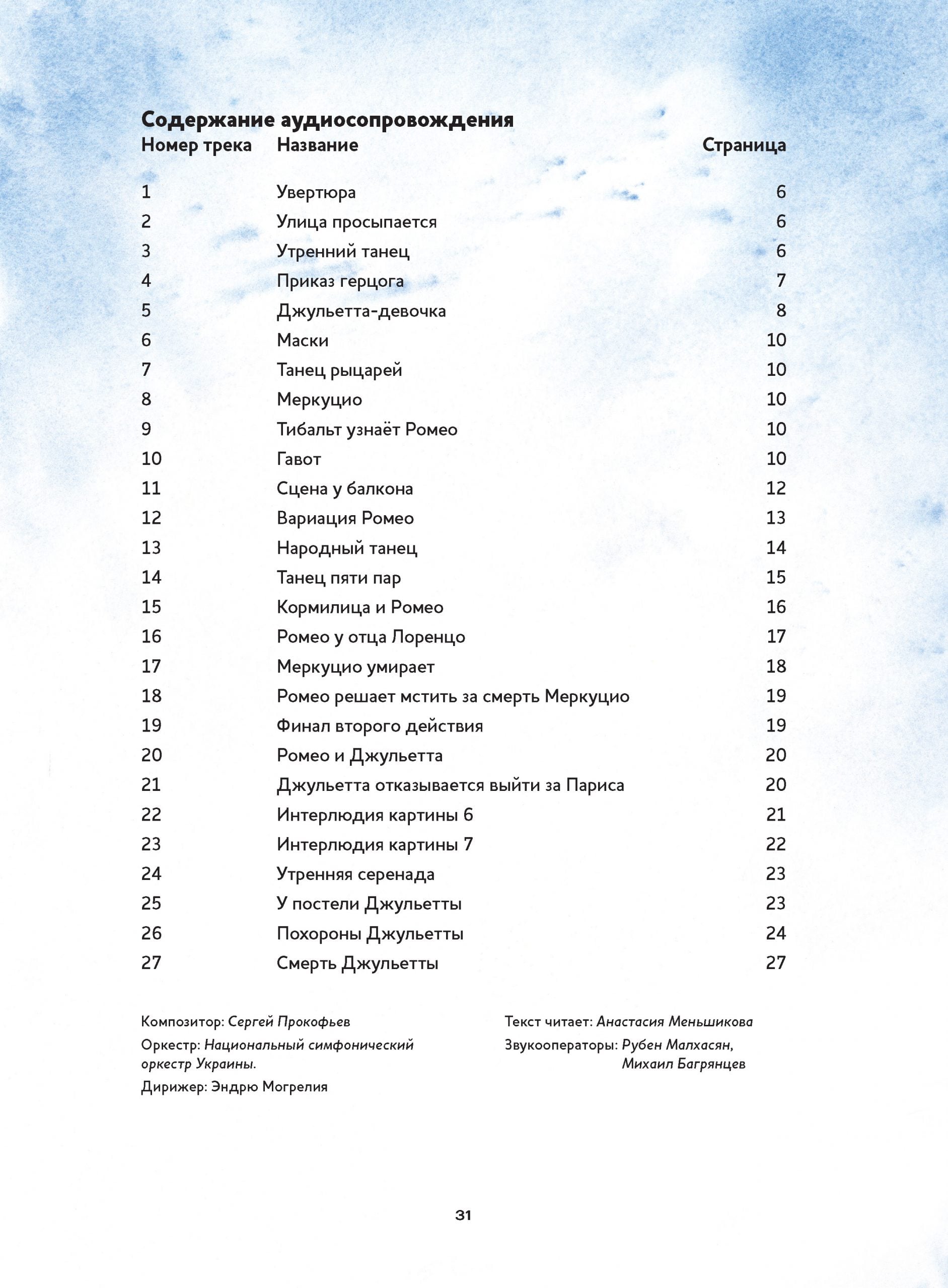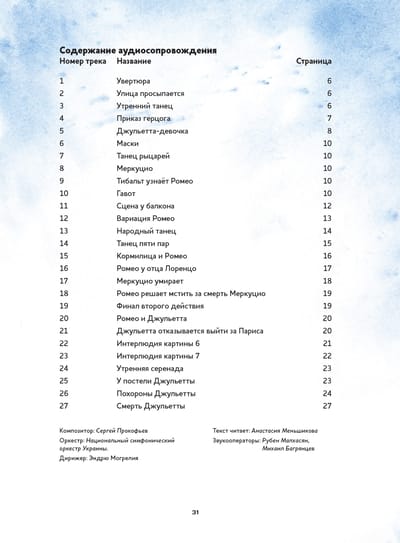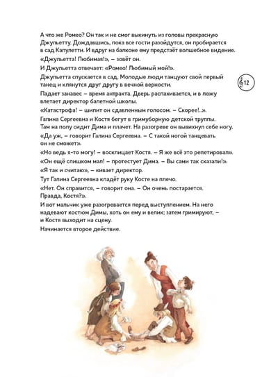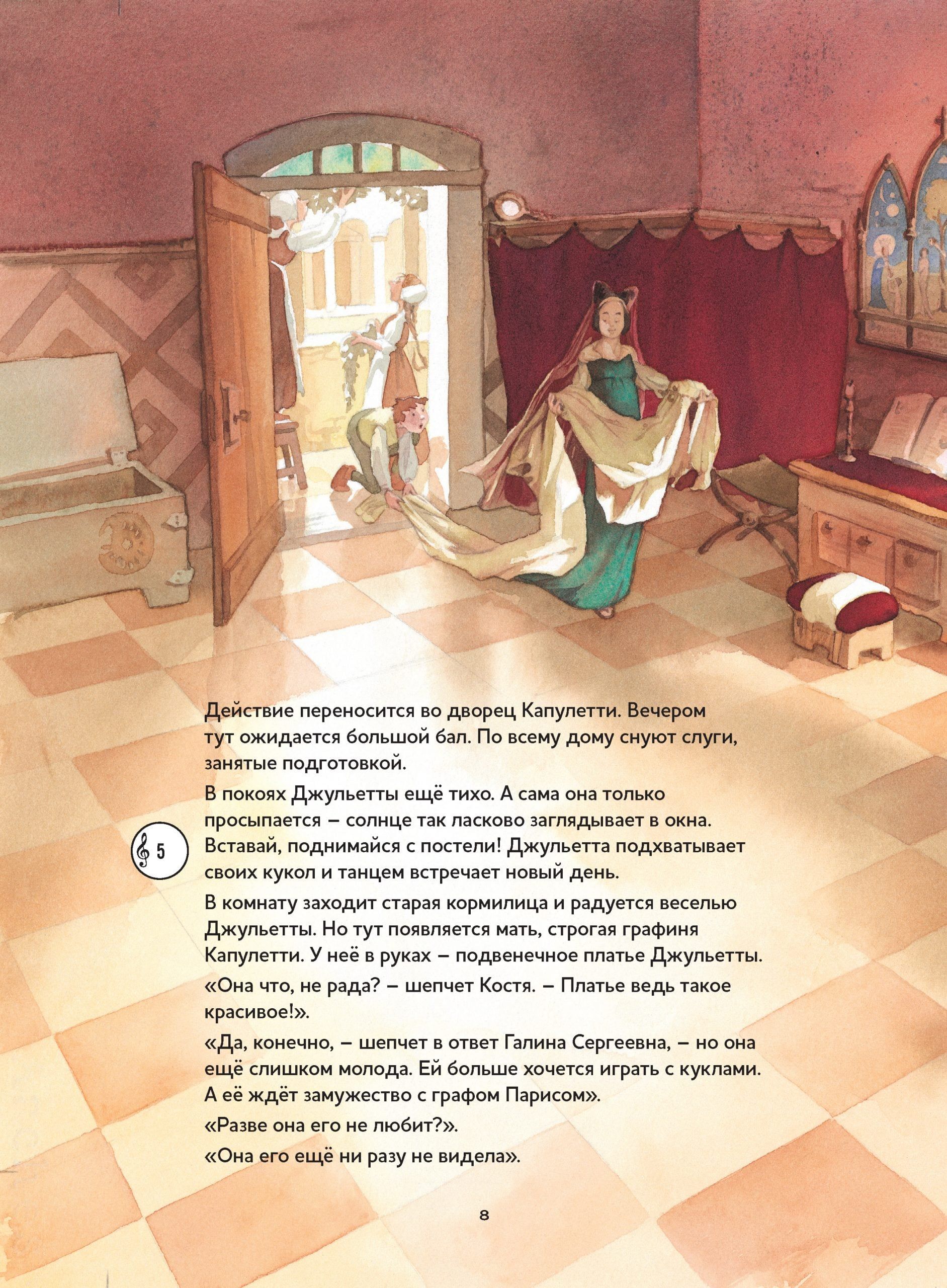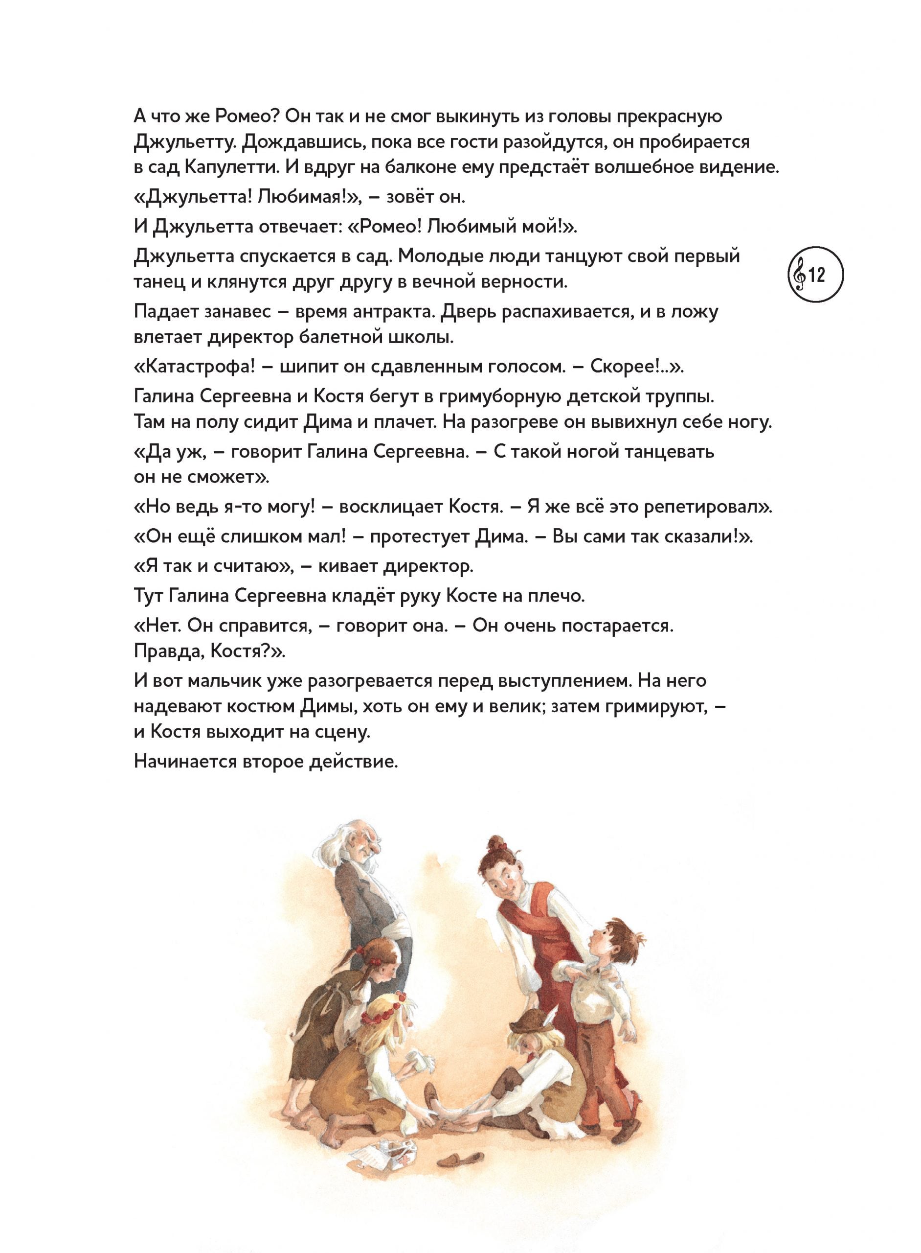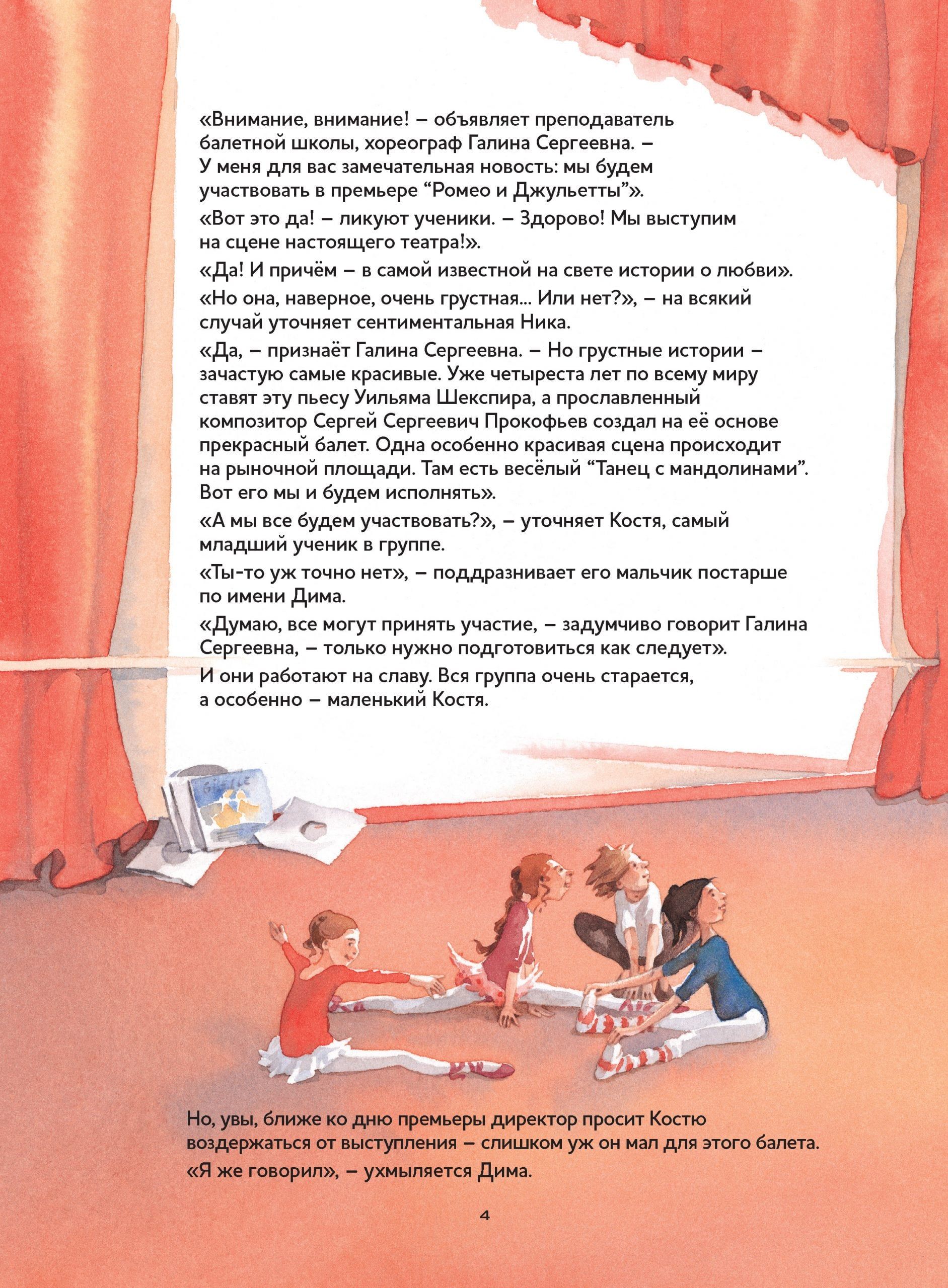 Enchanting sounds of music and fairy tale world on the pages of children's books! We present a collection that will not leave any adult or young reader indifferent! The series "Musical Classics for Children" from the publishing house "Content" was created with the assistance of the Moscow Drama Theater named after M. N. Ermolova. In the books of this series you will find a unique combination: librettos of the most famous masterpieces of world musical classics, adapted for children of preschool and primary school age, supplemented with a disk with melodies from the works themselves and interesting comments. The audio accompaniment is available via QR code or on CD. The text is read by Anastasia Menshikova. The tragic story of Romeo and Juliet, written by William Shakespeare in 1594-1595, is presented in this book through the eyes of a young ballet class student, Konstantin, who has the good fortune to take part in the production of a ballet to music by Sergei Prokofiev. The book's double storyline and delicate watercolor illustrations by artist Anette Bley will allow the youngest readers to get acquainted with the plot of the most famous tragedy without excessive drama.