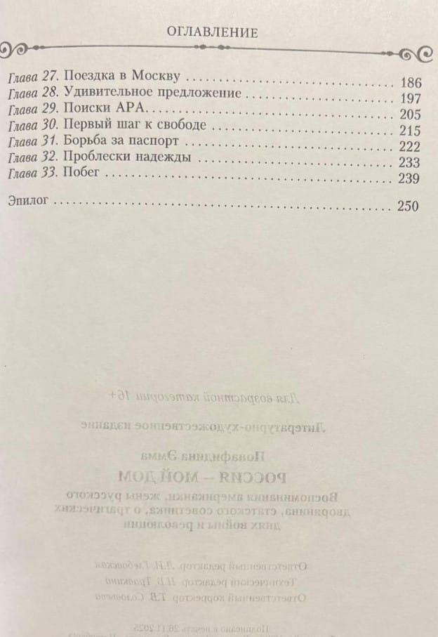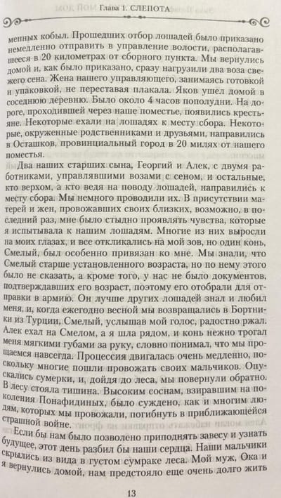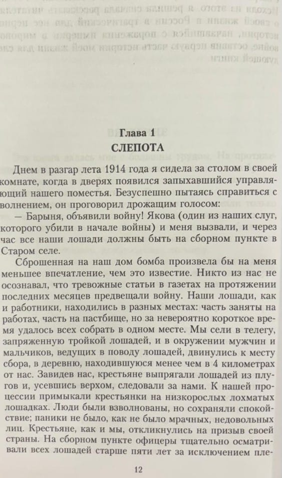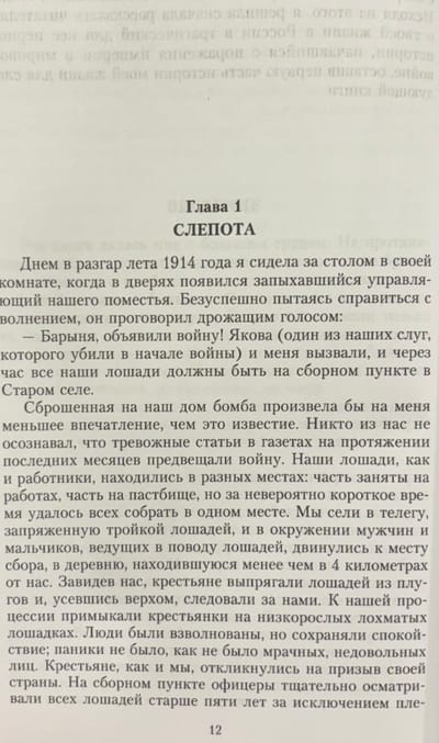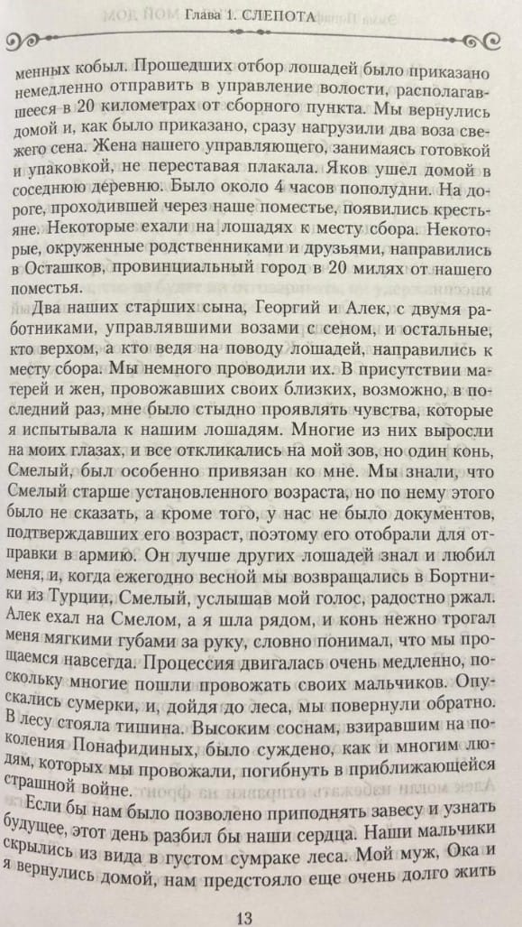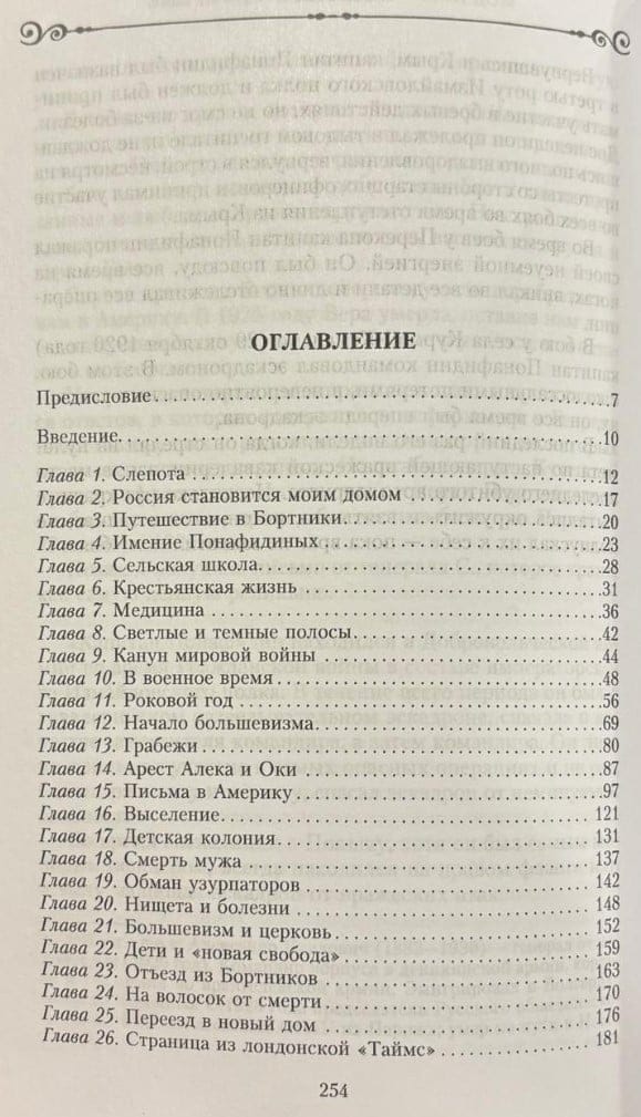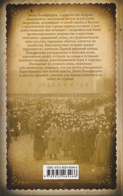 Emma Ponafidina, née Cochran, an American who married a Russian nobleman, recounts her life in Russia during a tragic period in the country's history. She begins her narrative with details of the daily life of the provincial gentry and peasants, describing their domestic routines, gastronomic preferences, folk customs, and household chores. This prosperous life is disrupted by the outbreak of World War I. Ponafidina recounts her husband's illness, her children's growing up, and her fear for her family amid wartime, revolutionary upheaval, and terror. Expelled from their home, deprived of their property, and realizing that it would be nearly impossible for them to survive under the new regime, Emma Ponafidina and her two sons risk their lives to flee the country.