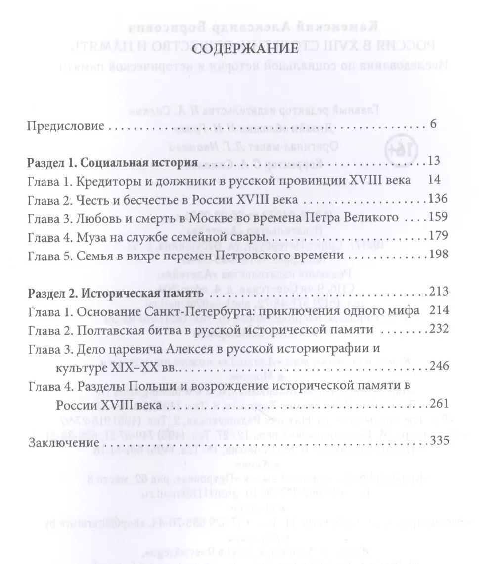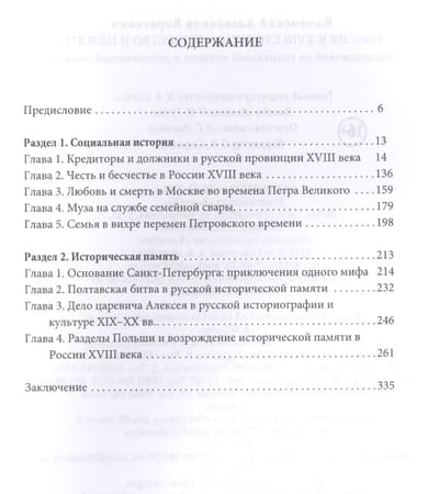 The focus of A. B. Kamensky's research based on a wide range of sources is the Russian society of the eighteenth century. The first section of the book presents works devoted to the way the society of that time was organized - what was its structure, internal ties, how mechanisms of social mobility worked, what were the everyday social practices. The second section examines how the historical memory of a number of key moments in the history of Russia in the eighteenth century was formed, what trace they left in literature and art, and how real events became historical myths.