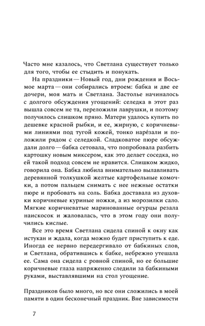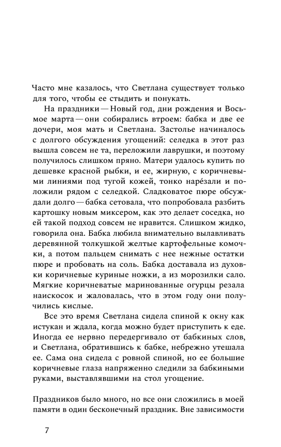 Oksana Vasyakina concludes her autofiction trilogy, which began with "The Wound" and "The Steppe," with a novel in which she attempts to unravel the mystery of her aunt Svetlana's short, almost weightless life. From small fragments of memory, a complex image emerges in which a difficult relationship with her mother, domestic instability, and indifference to her own fate coexist with an almost childlike vulnerability and purity. But the further the heroine delves into Svetlana's story, the more she realizes her inextricable connection with her and the more she learns about herself and the nature of her writing.