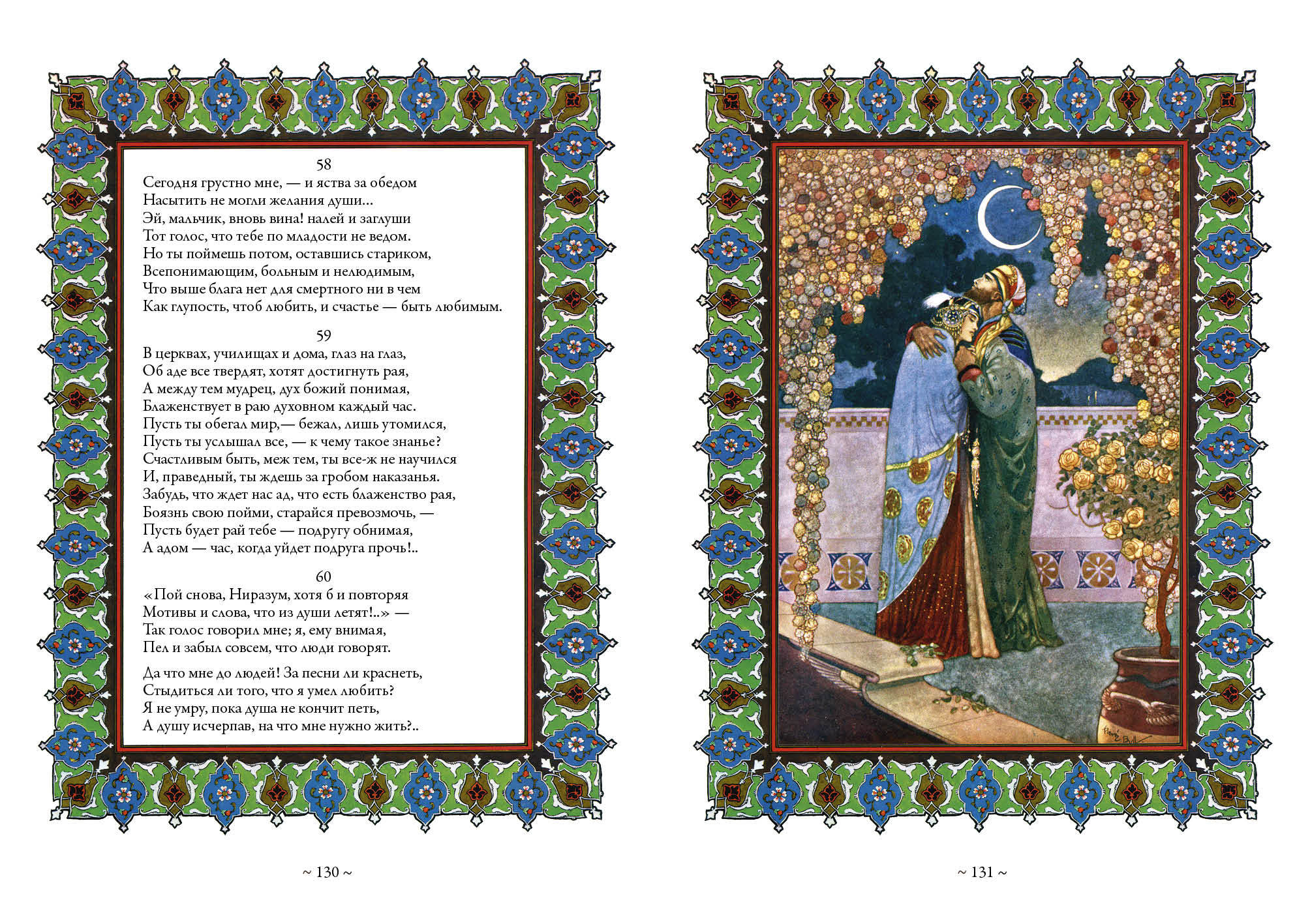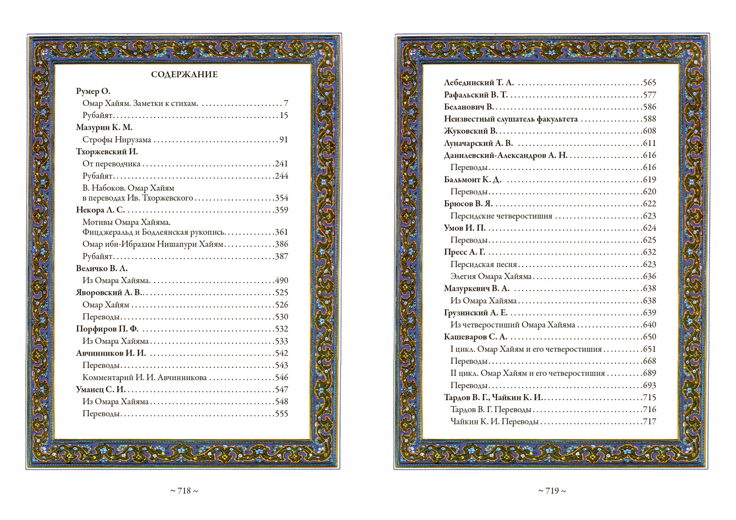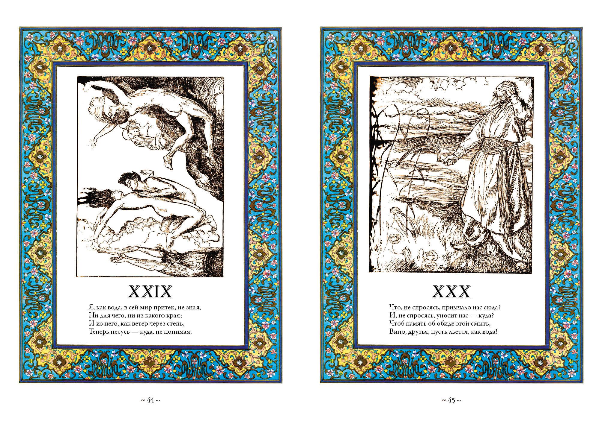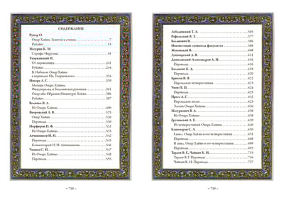 This collection includes translations of Omar Khayyam's poetry by twenty-four Russian authors in the late nineteenth and early twentieth centuries. Many of these translations were never published after the revolution. For each translator a brief historical note is given. The collection is decorated with works by British graphic artists E. Sullivan, R. Bull, E. Dulac, G. Ross, V. Poghani and Iranian miniaturist Hussein Behzad.