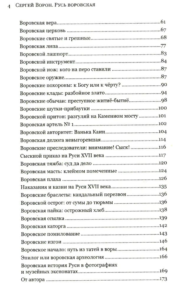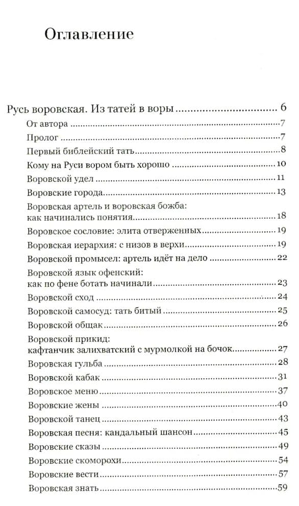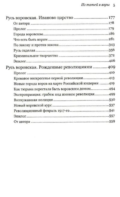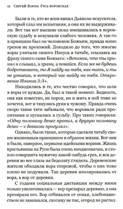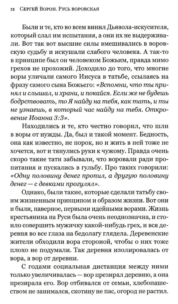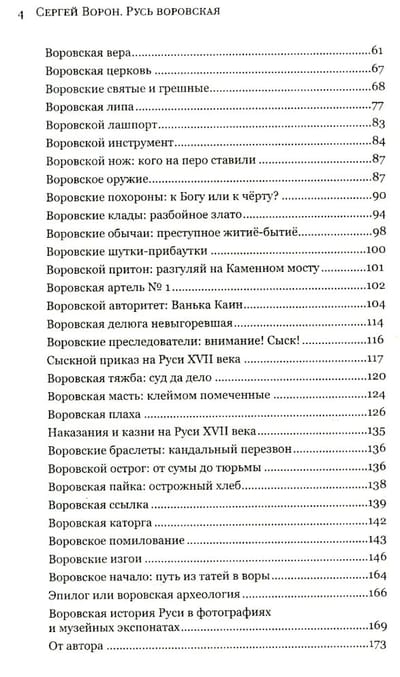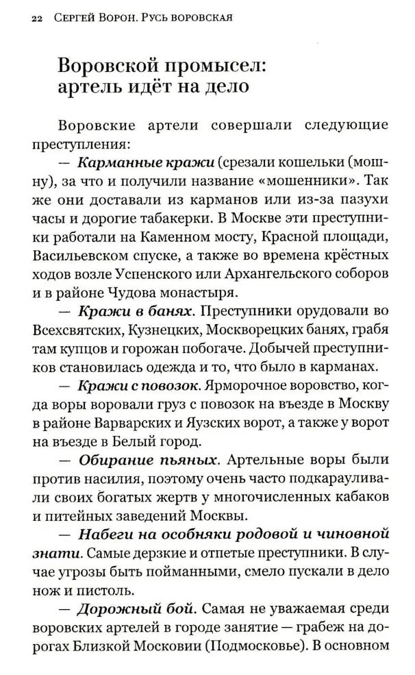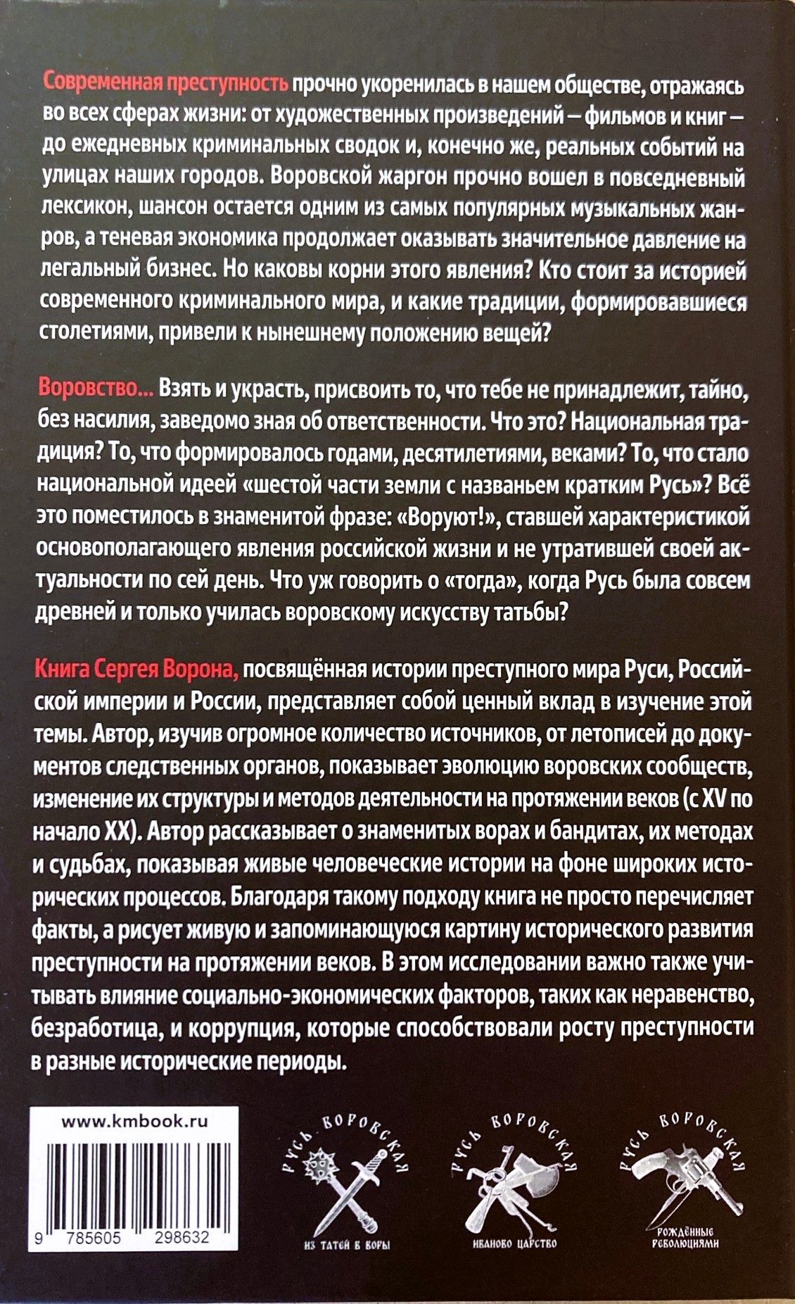 Sergey Voron's book, dedicated to the history of the criminal world of Rus', the Russian Empire and Russia, is a valuable contribution to the study of this topic. The author, having studied a huge number of sources, from chronicles to documents of investigative bodies, shows the evolution of thieves' communities, the change in their structure and methods of activity over the centuries (from the 15th to the beginning of the 20th). The author talks about famous thieves and bandits, their methods and destinies, showing living human stories against the background of broad historical processes. Thanks to this approach, the book does not simply list facts, but paints a vivid and memorable picture of the historical development of crime over the centuries. In this study, it is also important to take into account the influence of socio-economic factors such as inequality, unemployment, and corruption, which have contributed to the growth of crime in different historical periods.