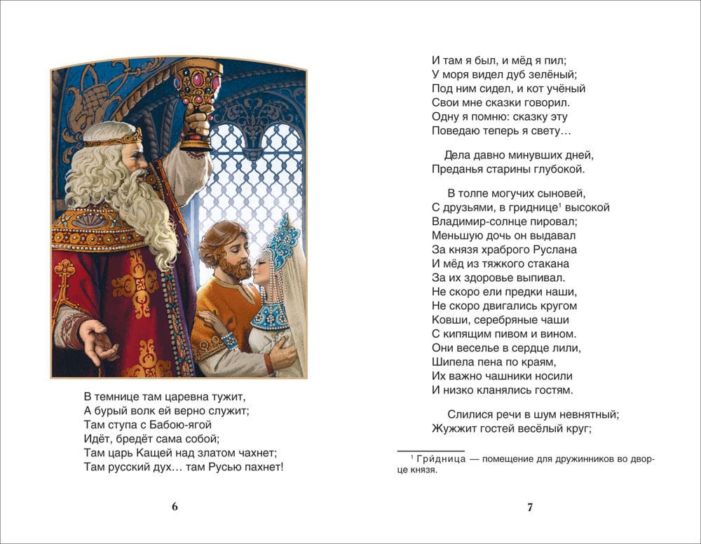 "Ruslan and Lyudmila" - a marvelous, timeless in the centuries of A. S. Pushkin's poem, written in the spirit and on the motives of ancient Russian fairy tales and bylinas. Pushkin's contemporaries enthusiastically accepted this magical fairy tale in verse. And since then every new generation has been worried about the beautiful Lyudmila, watching with bated breath the adventures of Prince Ruslan and wishing him victory over the evil dwarf Chernomor.