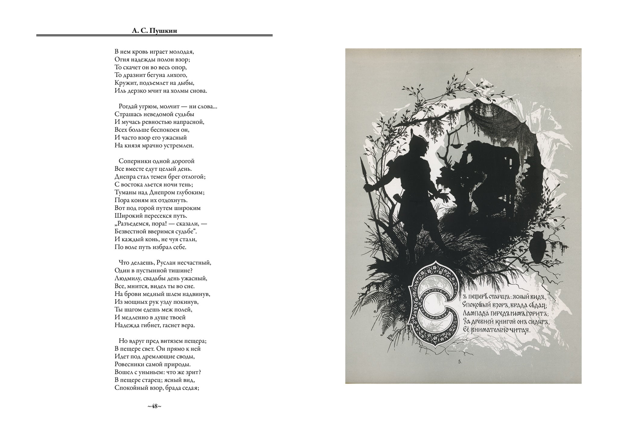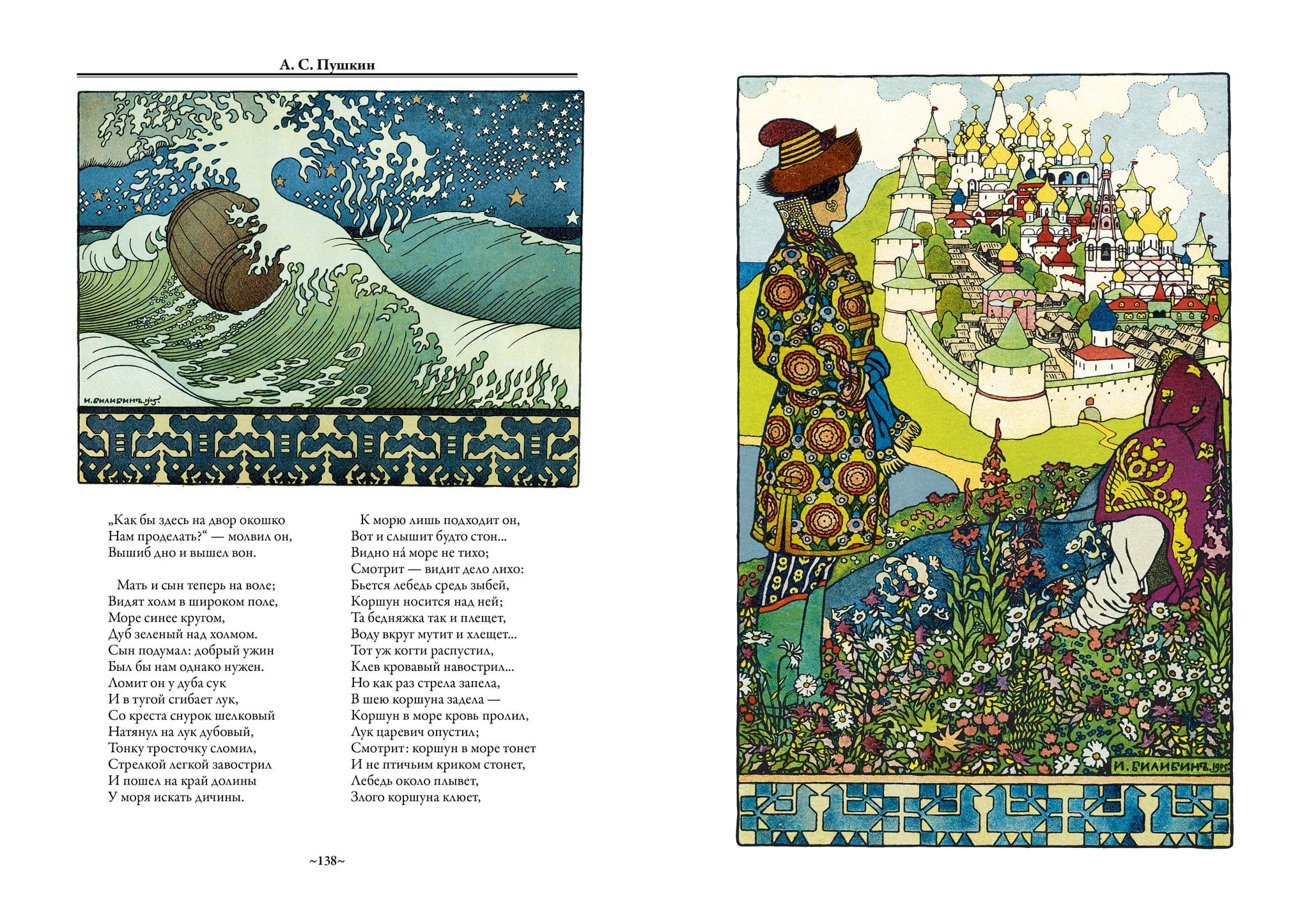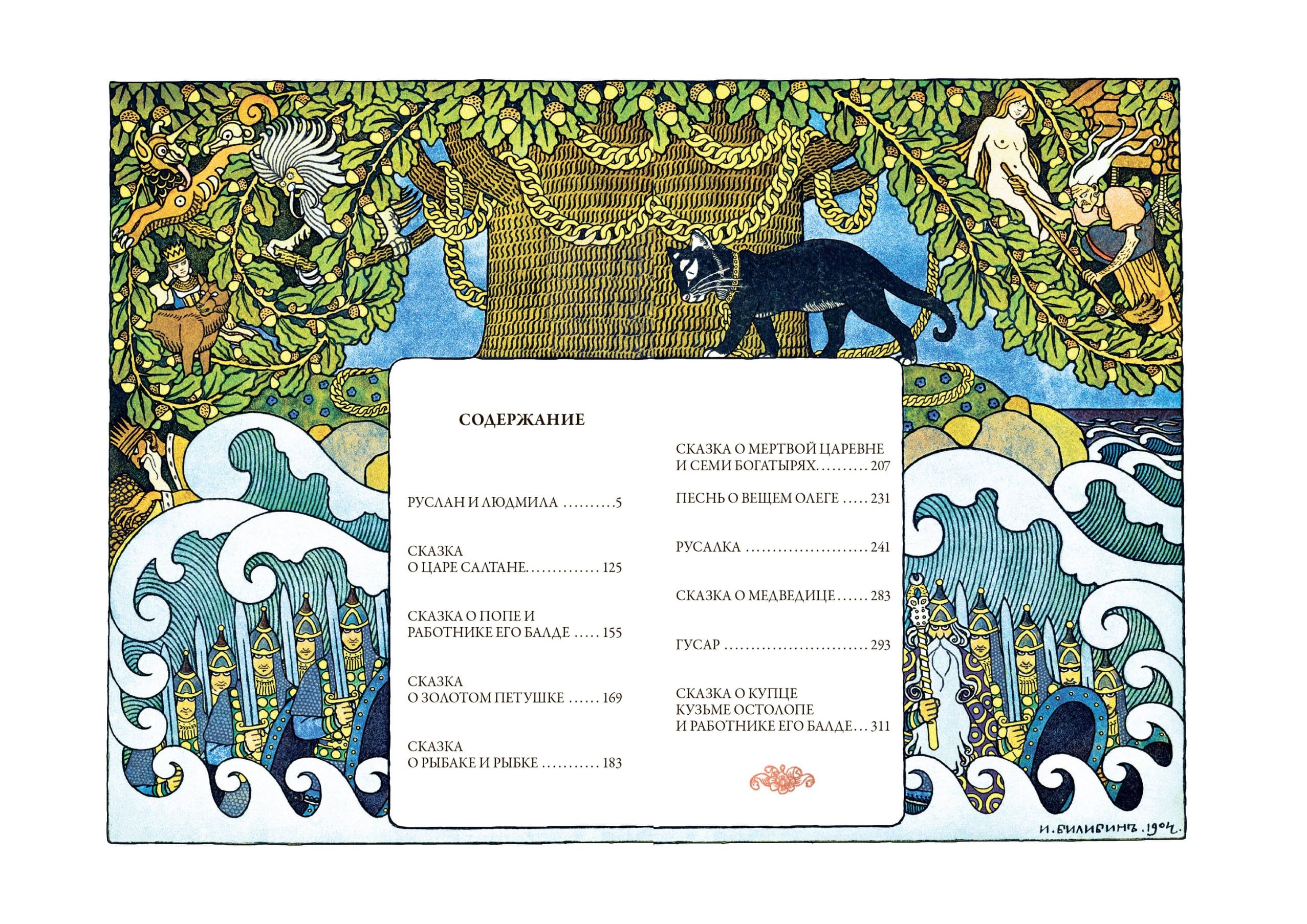 The collection includes ten works by Alexander Pushkin - the poem "Ruslan and Lyudmila" with a foreword by the literary historian M. G. Khalansky, the poem "Song of the Prophetic Oleg" and eight poetic fairy tales, including "The Tale of the Don and his Worker Balda". At the end of the collection is also this fairy tale, revised in 1840 for censorship reasons by Zhukovsky, with illustrations from the magazine "Jester". The texts of all tales are decorated with magnificent drawings by eight artists, including such masters of book illustration as I. Y. Bilibin, B. V. Zworykin and V. V. Zvorykin. V. Zworykin and V. M. Vasnetsov.