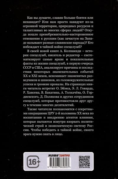 In his new book A. Kolpakidi - historian of intelligence services, writer and editor - systematizes the most striking and revealing facts from the life of intelligence services, primarily the USSR and the United States, analyzes the causes and consequences of some significant events of the XX and XXI centuries, recalls the famous spies and spies, their dizzying successes and high-profile failures. On the pages of the book, the reader will meet O. Ames, E. L. Howard, R. Hansen, V. Bakatin, A. Tolkachev, O. Gordievsky, D. Polyakov and other intelligence officers who opposed each other for many decades.