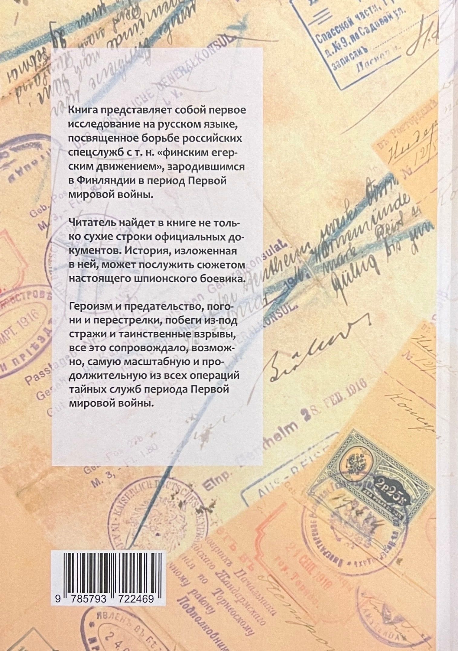The book is the first study in Russian devoted to the struggle of Russian special services against the so-called "Finnish Jaeger movement" that originated in Finland during the First World War. Using previously unknown archival materials, the author describes perhaps the largest and longest-running of all secret service operations during the First World War. Geographically, it covered not only the territory of Finland, but also unfolded over vast areas of Northern Europe (including Germany and the Scandinavian countries) and a significant part of the Russian Empire, right up to the Far East. The book is intended for anyone interested in the history of domestic counterintelligence, the history of the First World War, the military history of Russia and Finland, and the history of Russian-Finnish relations.