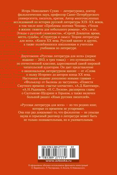 Igor Nikolaevich Sukhikh is a literary scholar, Doctor of Philology, professor at St. Petersburg University, writer, and critic. He is the author of numerous studies on the history of Russian literature of the 19th and 20th centuries, including the books “Problems of Chekhov’s Poetics,” “Chekhov in Life: Plots for a Short Novel,” “From… to… Studies in Russian Literature,” “Sergei Dovlatov: Time, Place, Destiny,” “Structure and Meaning: Literary Theory for Everyone,” “Books of the 20th Century. Russian Canon,” and others, as well as literature textbooks beloved by schoolchildren and teachers. The two-volume “Russian Literature for Everyone” (first published in 2013, in three volumes) is a guide to Russian classics, addressed to the widest possible readership. It provides an overview of the national literary canon, from “The Tale of Igor’s Campaign” to authors of the late 20th century. This edition is supplemented with new chapters - "Folklore: from bylina to ditty", "Tales of the Time of Troubles: happiness-ill-fortune", "A.D. Kantemir", "A.N. Radishchev", "N.S. Leskov", the chapters on Saltykov-Shchedrin and Gorky have been expanded, and a large section "The Language of Russian Writers" has been included. "Russian Literature for Everyone" is one of those rare books that do not become outdated over time. It once again proves that philology is not a dull science and a serious conversation about literature can be not only educational, but also fascinating.
