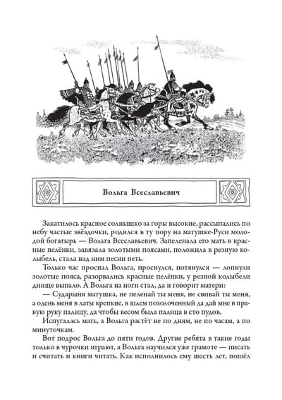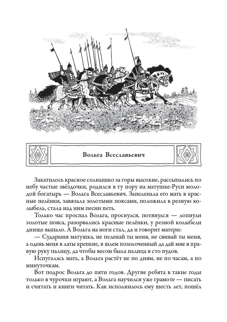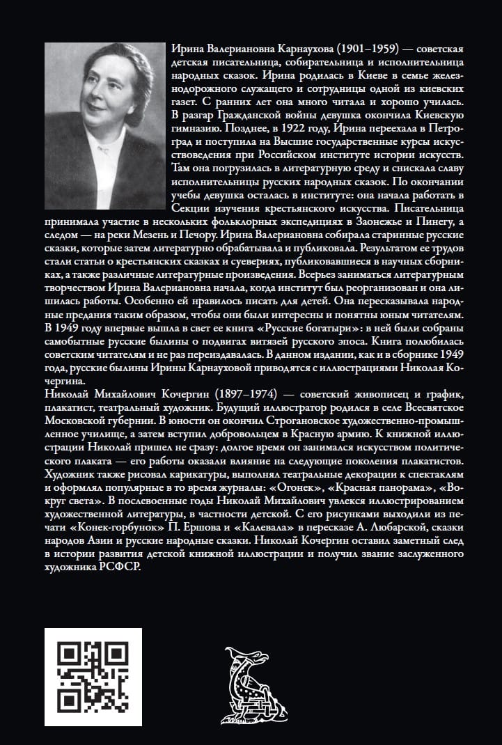 This edition includes nineteen Russian epics. They recount the glorious deeds of mighty knights, their victories over evil foes, and their faithful service to their native land. The tales of beloved heroes Alyosha Popovich, Dobrynya Nikitich, Ilya Muromets, and other heroes are reinterpreted by Soviet writer and folklorist Irina Valerianovna Karnaukhova. The talented Soviet artist Nikolai Mikhailovich Kochergin created wonderful, original illustrations.