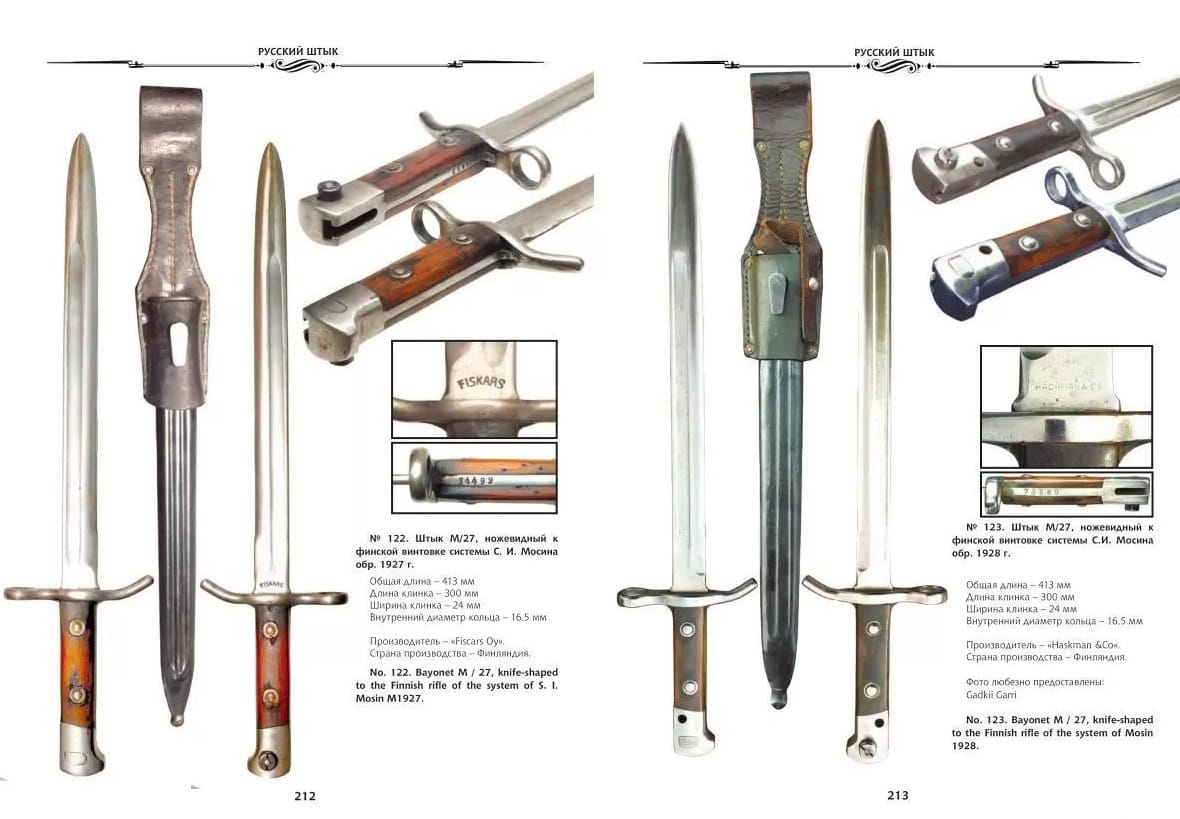 The number of bayonets shown in the book—complete or in fragments—has been significantly increased to 153. The section on the markings and markings found on bayonets for the Russian three-line rifle has been expanded, and the sections covering experimental bayonets, arsenal and workshop bayonets, and surrogate and ersatz bayonets from the First and Second World Wars have been significantly expanded. Furthermore, considerable attention is given to bayonets for the three-line rifle produced by other countries. For the first time in Russian arms literature, the book devotes significant attention to bayonets produced in Finland and Poland. Also featured are bayonets (and, in some cases, rifles and carbines) from other countries, such as Hungary, China, Romania, the United States, France, and others.