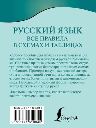 Universal manual for studying and systematizing knowledge of the main sections of the Russian language. Rules and complex topics are presented in an accessible, clear and concise manner thanks to visual schemes and tables. The rules are illustrated with excerpts from fiction and live speech. As additional material in the book there are useful appendices with lists of vocabulary words, accentological minimums, grammatical errors and other important information.