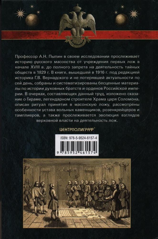Professor AN Pypin in his study traces the history of Russian Freemasonry from the establishment of the first lodges in the early XVIII century to a complete ban on the activities of secret societies in 1829. The book, published in 1916 under the editorship of historian GV Vernadsky and has not lost relevance to this day, collected and systematized invaluable materials on the history of spiritual brotherhoods and orders of the Russian Empire. In the essays that make up this work, set out the story of Hiram, the legendary builder of the Temple of King Solomon, described the ritual of admission to the Masonic lodge, considered the peculiarities of the charter of the free masons, Rosencreucers and Templars, as well as traces the evolution of the views of the supreme authority on the activities of lodges.