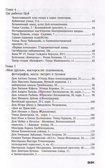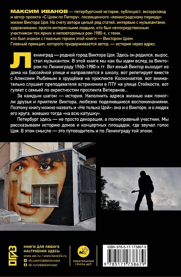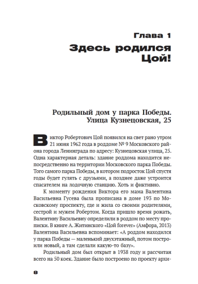Leningrad is Viktor Tsoi's hometown. He was born here, grew up here, and became a musician. In this book, we follow Viktor through Leningrad in the 1960s–1980s. Here, young Viktor leaves his house on Basseynaya Street and heads to school; here, he rehearses with Alexei Rybin in a Khrushchev-era building on Kosmonavtov Avenue; here, he listens attentively to an astronomy teacher at a vocational school on Stoikosti Street; here, he strolls with his family around Veteranov Avenue...