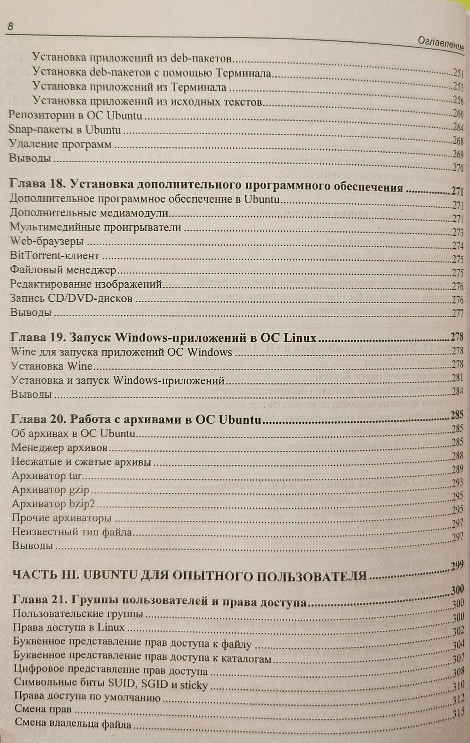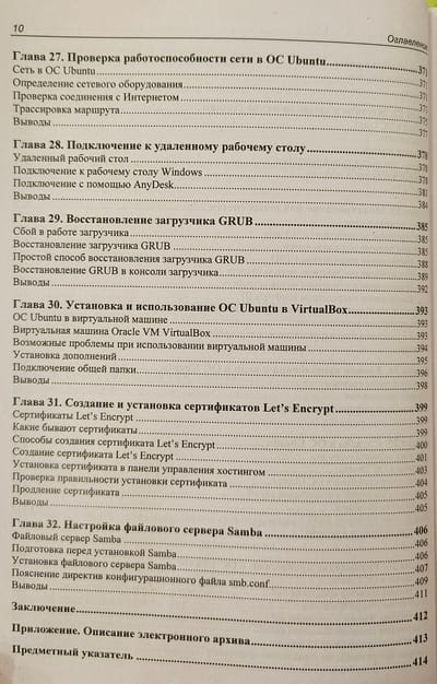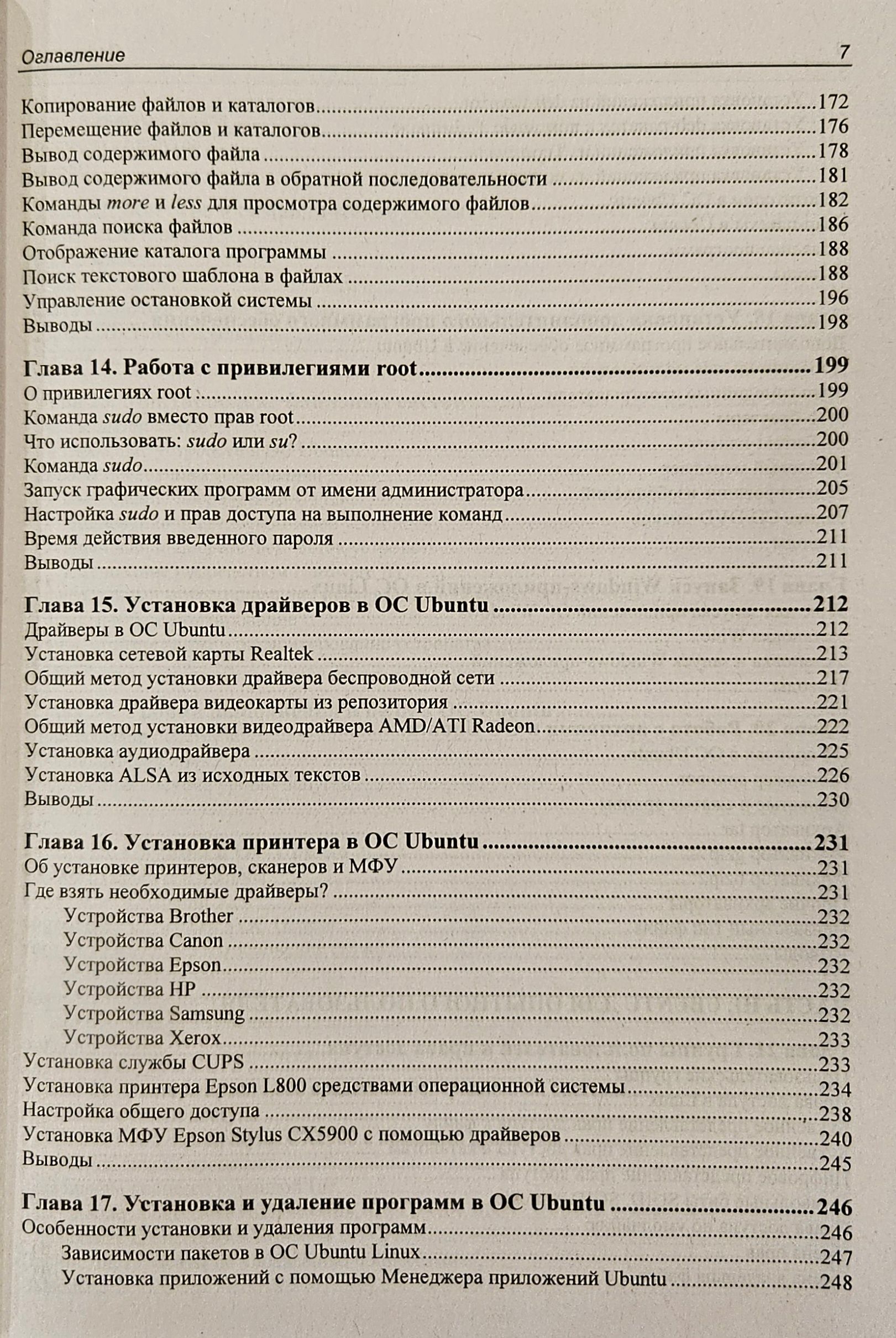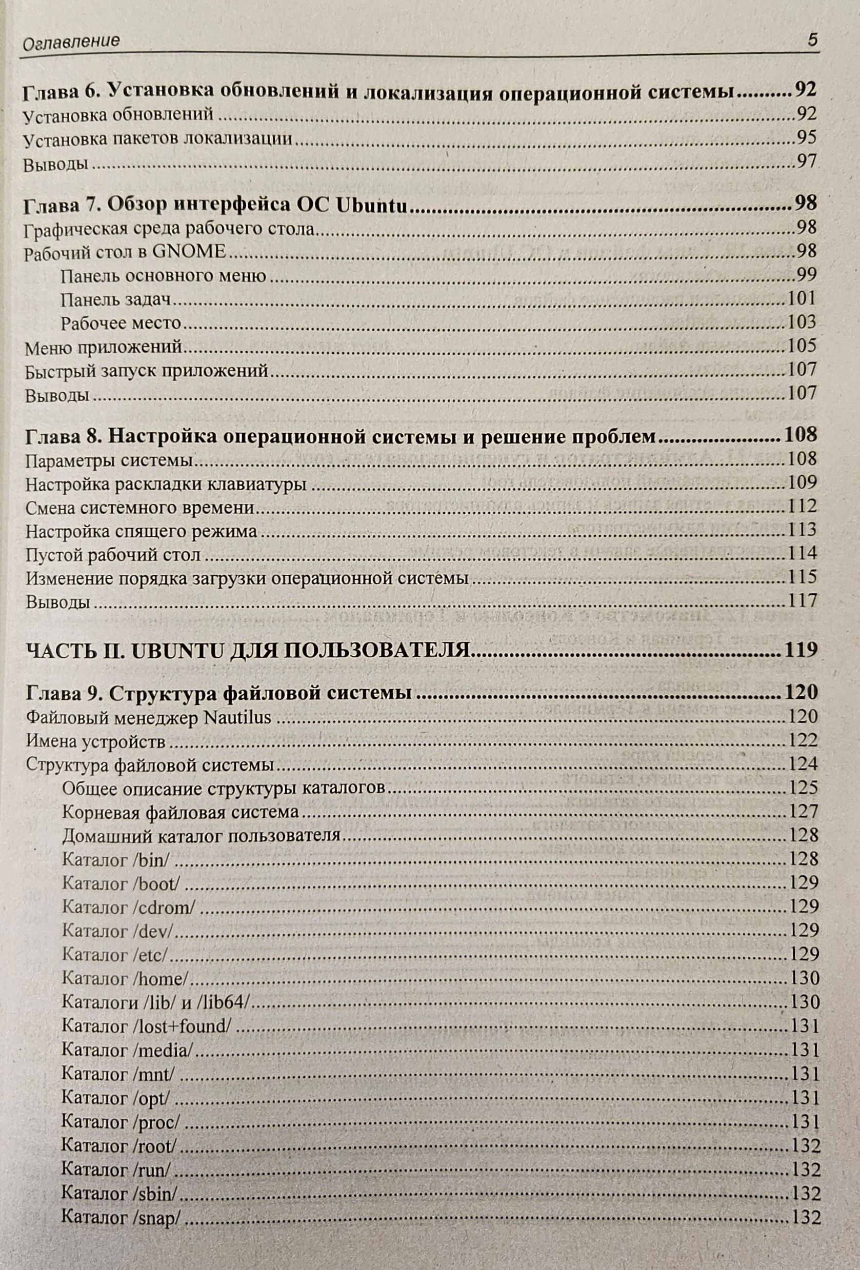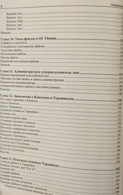 From the point of view of the user, work in the popular Ubuntu Linux operating system is considered, including installation and configuration of the system, drivers for working with printers, scanners and other peripheral equipment. The process of installing programs and setting up an Internet connection is described. Advice on the use of graphic mode and command line. The system services of Ubuntu Linux are described, questions on user access rights are covered. Information on the search for network malfunctions and elimination of system failures is provided. The material is relevant and applicable to other Linux-like operating systems.