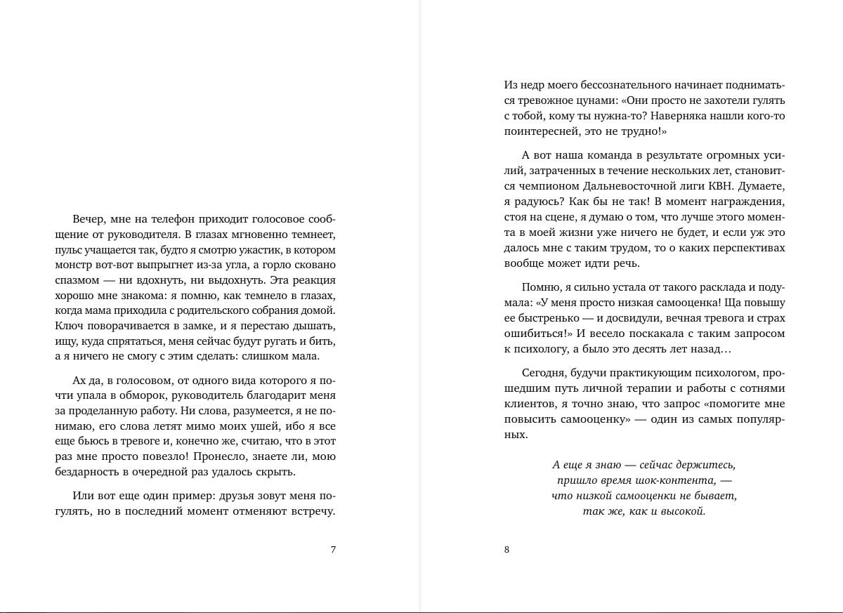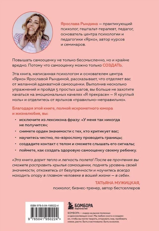 This book, written by Yaroslava Ryndina, psychologist and founder of the Yarko Center, explains what prevents you from achieving the healthy self-esteem you desire. By completing a few exercises and following 5 simple steps, you'll no longer want to swing on the emotional roller coaster of "I'm beautiful - I'm a complete zero" and detach yourself from feelings of "right - wrong."