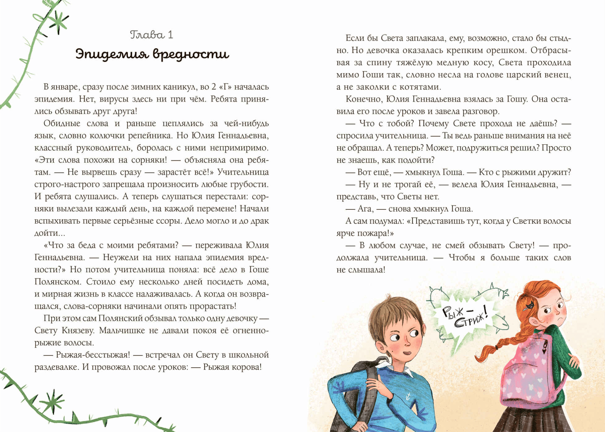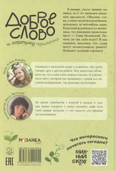 After winter break, an epidemic of bad language broke out in Form 2G. Hurtful words, like burrs, clung to someone's tongue. The homeroom teacher figured out that Gosha Polyansky was the culprit. Why was he acting like this? And how could she show the boy that words can truly hurt? An unusual experiment and green peas could help!