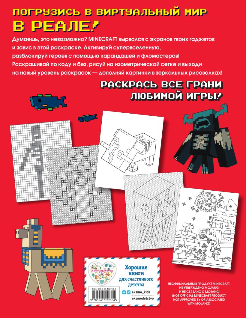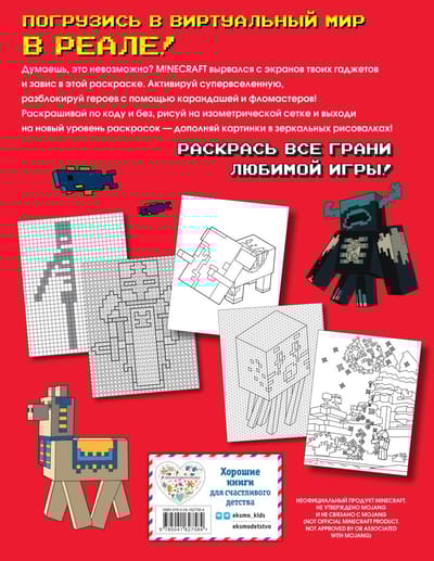 The long-awaited sequel! More coloring and drawing in your favorite universe! Edition is intended only for real fans of Minecraft! All mobs please do not bother! Color, draw on an isometric grid, recreate characters by color code and try a new coloring super quest - mirror drawing! Minecraft has never seen anything like this before! The heroes of your favorite universe are back in the real world and settled on the pages of a new unrealistically cool coloring book! Grab your pencils and hit the world of blocks with a hefty dose of coloring! Success, young fan! You're the only one who decides how your Minecraft will look like!