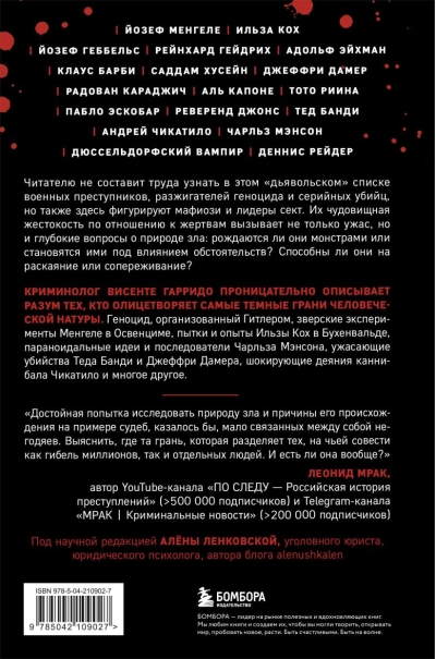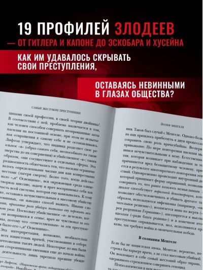 "The Most Violent Criminals" is a disgusting collection of villains not only among serial killers, but also political figures and Nazi criminals. All of them, to varying degrees, have psychopathy, pathological narcissism, sadistic tendencies, paranoid mentality and the ability to hide their crimes or appear to be benefactors. The author of the book deeply analyzes the reasons for their crimes, motives and ideas that they blindly believed in. The genocide organized by Hitler, the brutal experiments of Mengele in Auschwitz, the torture and experiments of Ilse Koch in Buchenwald, the paranoid ideas and followers of Charles Manson, the horrific murders of Ted Bundy and Jeffrey Dahmer, the shocking deeds of the cannibal Chikatilo and much more.