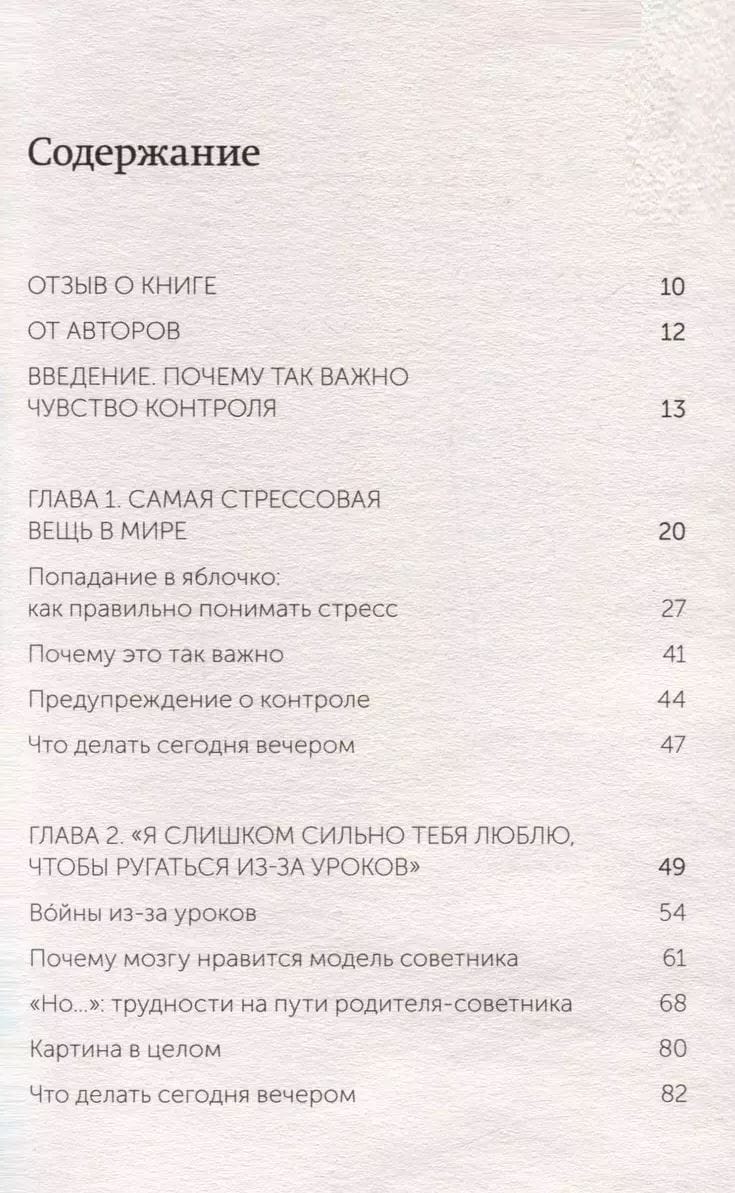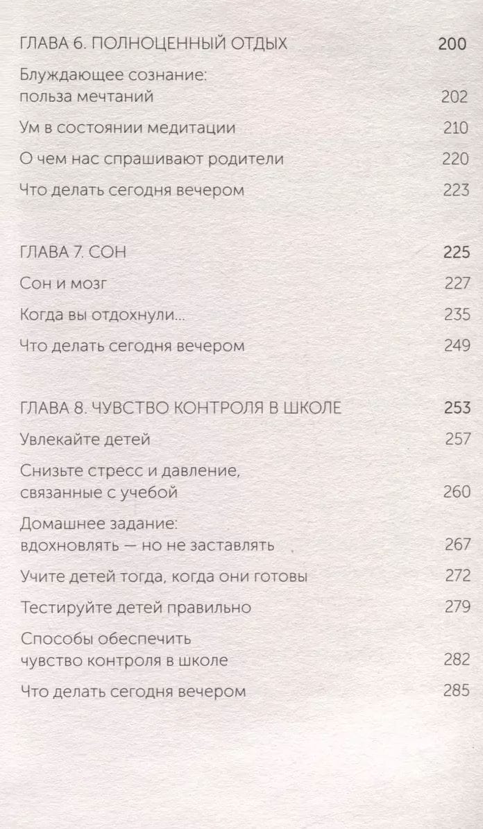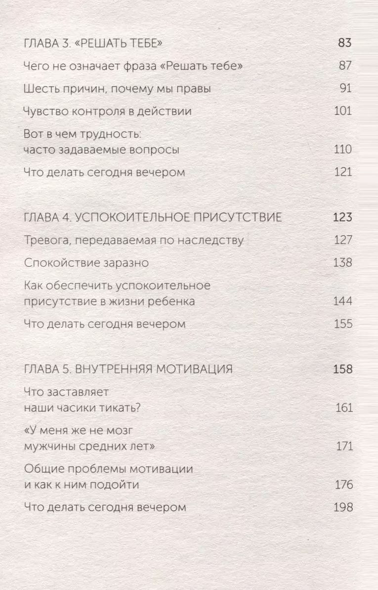 Gradually, from chapter to chapter, step by step, the authors lead us to the idea: even if it seems to you that your child is not able to make a single correct decision (or has special features - ADHD, ASD) - you need to give him a chance. To do this, they offer specific steps-exercises at the end of each chapter that you can use today. What, according to the authors, helps on the path to children's independence? The basis is the absence of stress. It can be caused by coercion, overprotection, various fears, and the child's characteristics. The absence of fear is followed by a sense of security, which is given by parental love, good sleep, internal motivation, and exercise. And, of course, the parent's work on themselves and on new relationships with the child.