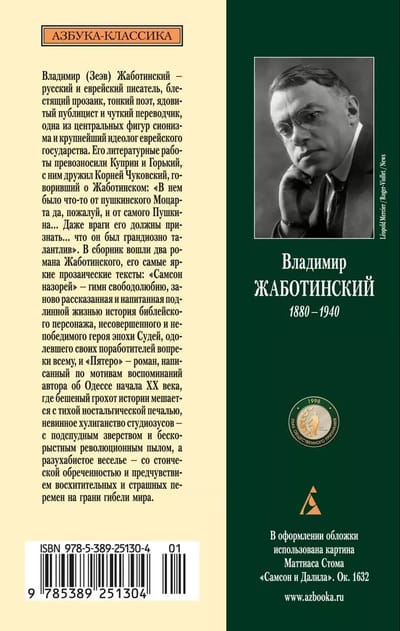 Vladimir (Zeev) Jabotinsky (1880–1940) was a Russian and Jewish writer, a brilliant prose writer, subtle poet, caustic publicist, and sensitive translator, one of the central figures of Zionism, and the greatest ideologist of the Jewish state. His literary works were praised by Alexander Kuprin and Maxim Gorky, and he was friends with Korney Chukovsky, who towards the end of his life said of Jabotinsky: “There was something of Pushkin’s Mozart in him, and perhaps even of Pushkin himself... Even his enemies must admit... that he was enormously talented.” This collection includes two of Jabotinsky’s most striking prose texts, the novels Samson of Nazareth (1926) and The Five (1936). The novel Samson of Nazareth is a hymn to the love of freedom, a re-told and life-filled story of a biblical character, an imperfect and invincible hero of the era of the Judges. It would seem that the plot is familiar to everyone (Samson tearing apart the lion's jaws; Samson killing a thousand enemies with a donkey's jawbone; Samson and Delilah; Samson triumphing over the Philistines), but Jabotinsky tells about what remains behind the scenes: about the wisdom and anger that slowly grow from the very human gut, and about the impossibility and inevitability of victory. And in the novel "Five", written based on Jabotinsky's memoirs about Odessa in the early 20th century, the furious roar of history is mixed with quiet nostalgic sadness, the innocent hooliganism of students - with latent brutality and selfless revolutionary fervor, and reckless fun - with stoic doom. Here, the irrepressible love of life and gloomy laughter of Babel's "Odessa Tales" echo, at times, the almost childish pathos of Kataev's "The Lonely Sail Glows White", and sometimes even the elegiac quality of the very distant and yet close Vilno from Alexandra Brushtein's "The Road Goes into the Distance...", but the heroes of "The Five" are no longer children, and therefore, most clearly and furiously, it rings with a premonition of delightful and terrible changes on the brink of the destruction of the world.