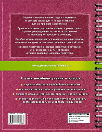 The book of the series "The most complete course: lay out on the shelves" includes material on all the main topics of the school course of mathematics and Russian language for grade 4. The manual contains rules and tasks to firmly consolidate them. The material of the manual is distributed by topics and is arranged on the principle from simple to complex. For successful learning it is important to know the rules well, but it is even more important to be able to apply them. The purpose of the manual is to "put everything on the shelves", i.e. to systematize the acquired knowledge and work out the subject skills of the child on various types of tasks. The child will learn to calculate quickly and without errors, master algorithms for solving typical problems, master the skill of literate writing and literate speech. The manual can be used as supplementary material in class and for independent study at home.