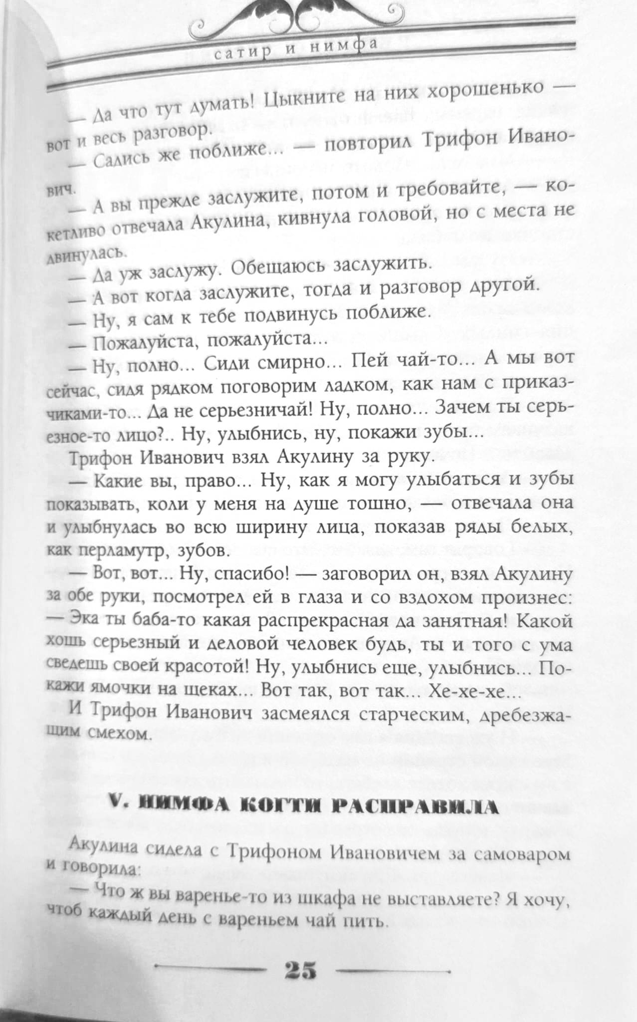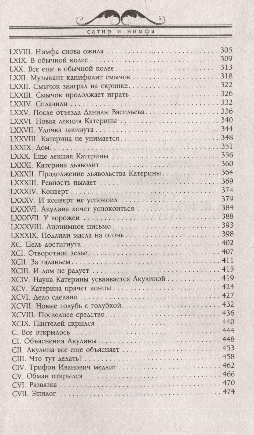 A chronicler of Russia's life in the late 19th and early 20th centuries, satirist Nikolai Aleksandrovich Leykin, as always, accurately captures the images of his compatriots of the most diverse classes and characters that he has seen in life. In this novel, which is funny in some ways and sad in others, the most diverse types of characters are wittily played out. The lonely elderly merchant Trifon Ivanovich Zakolov is filled with warm feelings for his cook Akulina. The modest and quiet woman is truly transformed under the influence of her new status in the house, and the dynamics between the "satyr" and the "nymph" change dramatically. A friend-maid gives Akulina useful advice, from her point of view, and a relative from the village asks for a lucrative position, and it is far from immediately clear what the chain of events that began with simple sympathy will lead to.