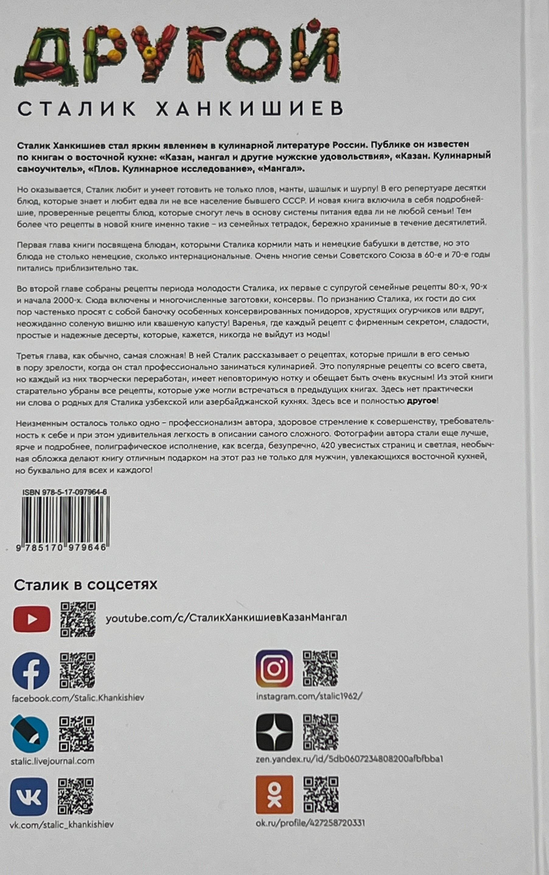 All recipes that may have already been found in previous books have been carefully removed from this book. There is practically not a word about Uzbek or Azerbaijani cuisines, which are native to S. Khankishiev. Everything here is completely OTHER!