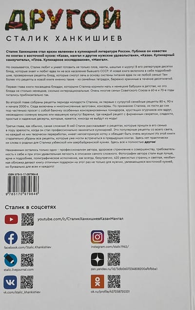 Stalik Khankishiev has become a bright phenomenon in Russian culinary literature. He is known to the public for his books on oriental cuisine: "Kazan, Brazier and Other Male Pleasures", "Kazan. Culinary self-study", "PLOV. Culinary research", "MANGAL".