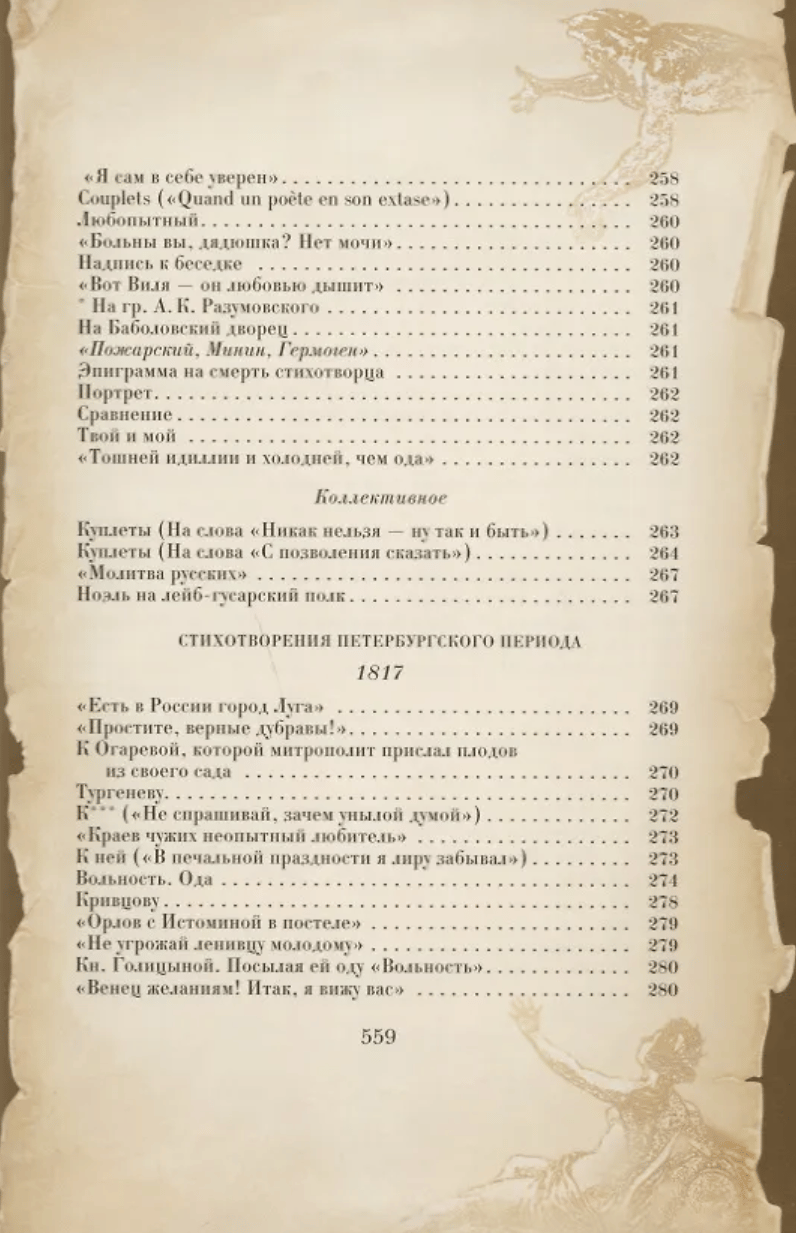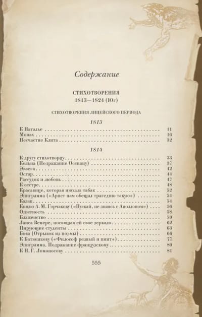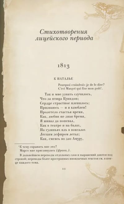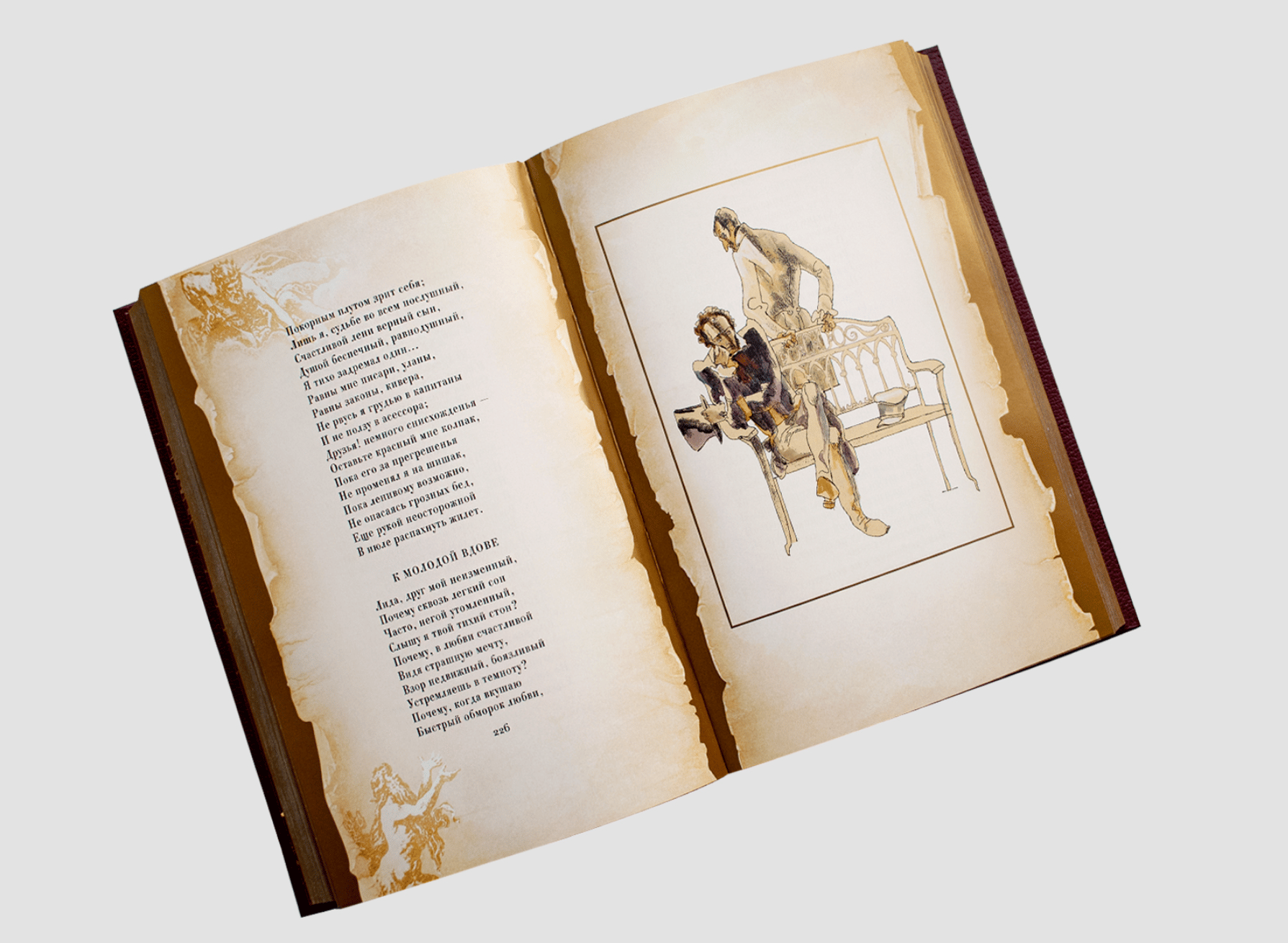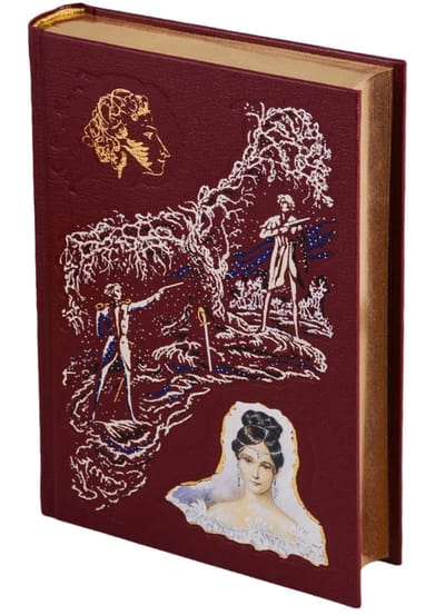 The finest edition of A.S. Pushkin's works in the history of printing. This edition is a true masterpiece, embodying the harmony of content and design. A large number of illustrations, a three-sided gold edge, a silk ribbon bookmark, a binding with original embossing using five types of foil, coated paper, a thoughtful format, colorful headpieces, and pages stylized as scrolls of old paper framed in gold complete the design of this edition, unrivaled in its level of printing. This book will be a true gem for any library, even the most exquisite, in the world.