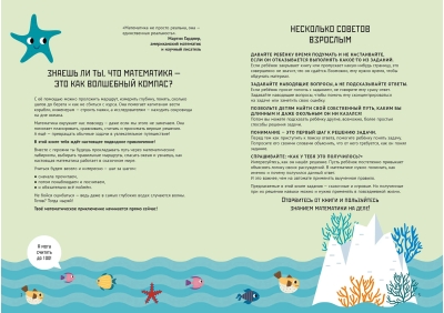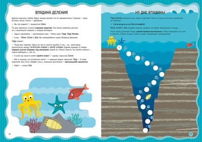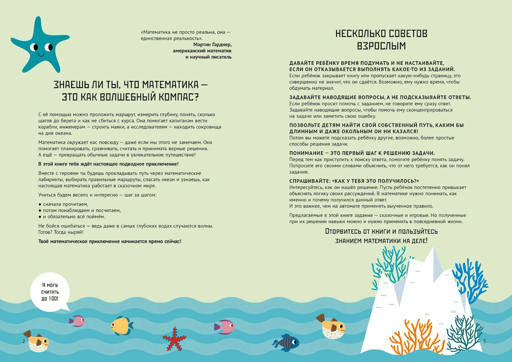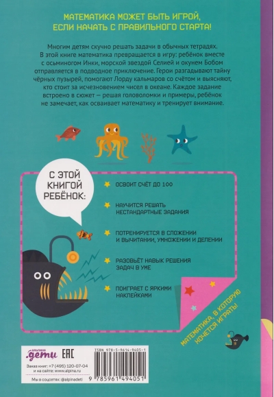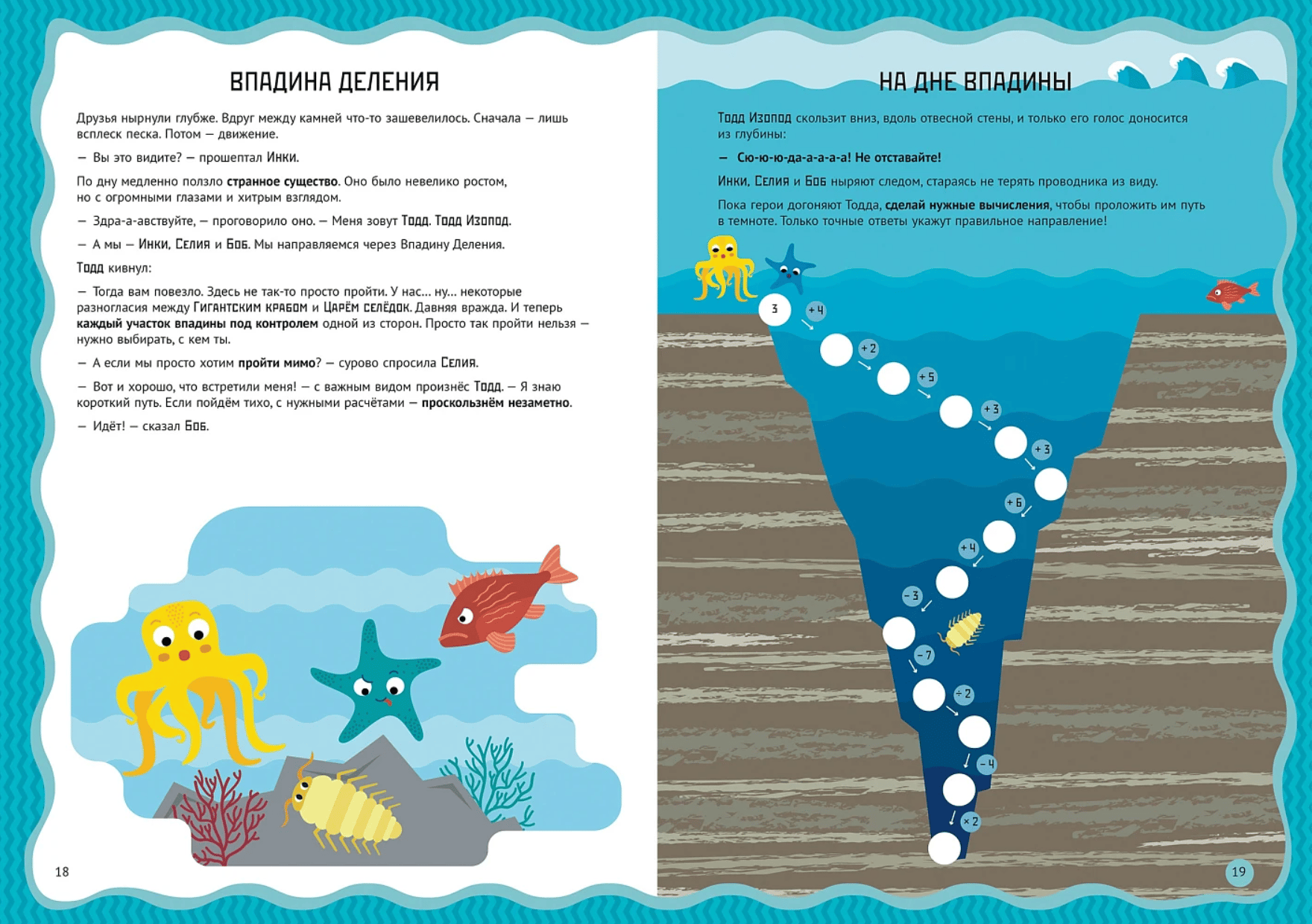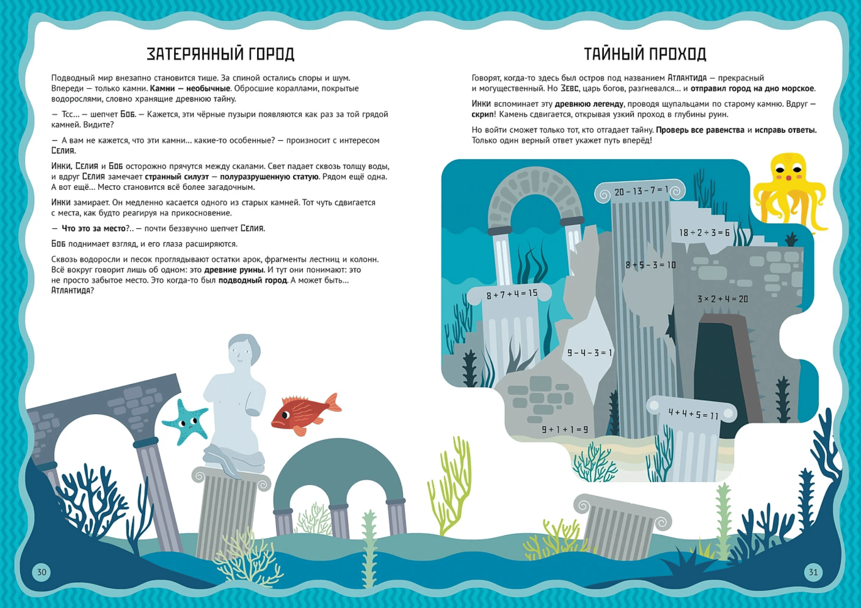 The book is structured as an underwater adventure, in which the child, along with its characters—Inky the octopus, Celia the starfish, and Bob the bass—sets off into the mysterious Ocean of Calculations. Each chapter offers a new story and a new math problem: they must recharge with the energy of numbers, solve the mystery of the fish eggs, navigate a coral labyrinth, repair a destroyed reef, outsmart the squids, and even win a math tournament.