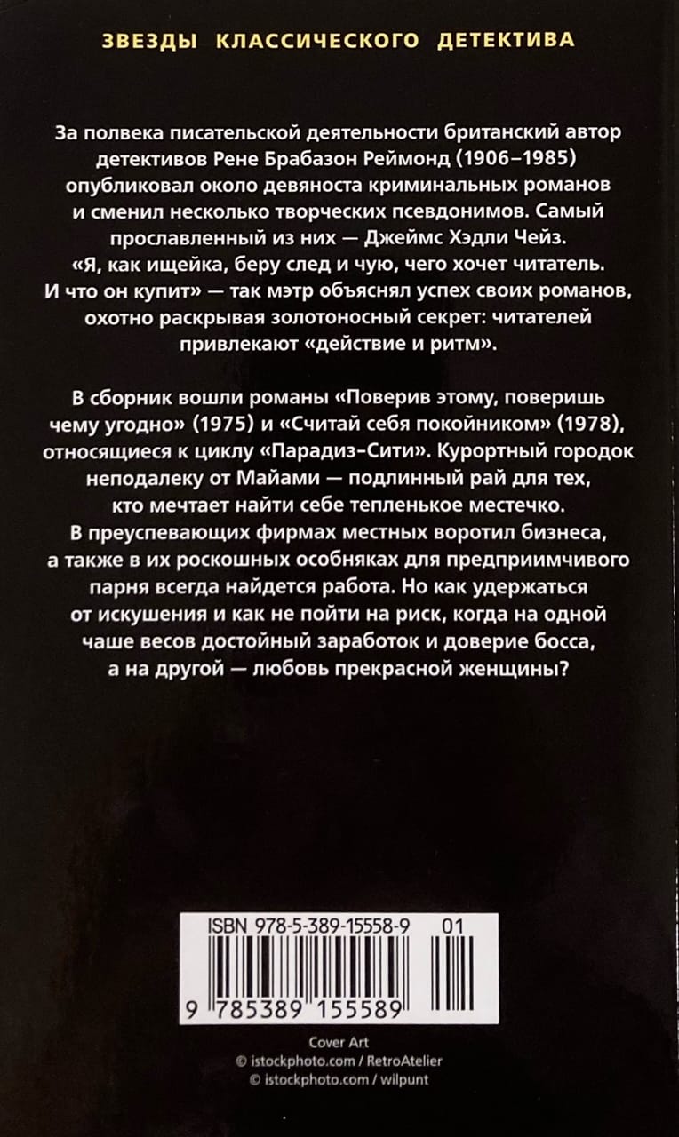 The collection includes the novels “Believing This, You Will Believe Anything” (1975) and “Consider Yourself a Dead” (1978), related to the Paradis City cycle. The resort town near Miami is a real paradise for those who dream of finding a warm place. In the successful firms of local business tycoons, as well as in their luxurious mansions for the enterprising guy there is always a job. But how to resist temptation and how not to take risks, when on one side of the scale worthy of earnings and trust of the boss, and on the other - the love of a beautiful woman?