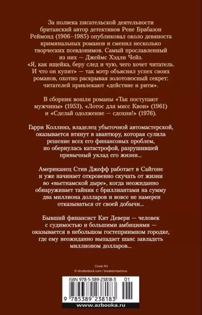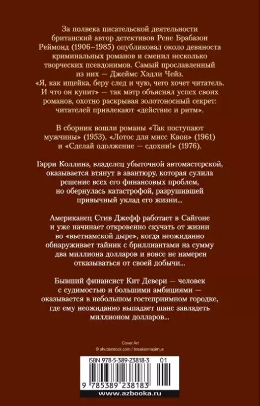 For half a century of writing, British detective author Rene Brabazon Raymond (1906-1985) published about ninety crime novels and changed several creative pseudonyms. The most celebrated of these is James Hadley Chase. "Like a bloodhound, I pick up the trail and smell what the reader wants. And what he will buy" - so the maestro explained the success of his novels, willingly revealing the gold-bearing secret: readers are attracted to "action and rhythm." The collection includes the novels "This is what men do" (1953), "Lotus for Miss Kwon" (1961) and "Do a favor - die!" (1976). Harry Collins, owner of an unprofitable machine shop, is drawn into an adventure that promised to solve all his financial problems, but turned out to be a disaster that destroyed the usual way of life ... American Steve Jeff works in Saigon and is beginning to frankly bored with life in the "Vietnamese hole" when suddenly discovers a stash of diamonds worth two million dollars and does not intend to give up his booty ... Former financier Keith Devery - a man with a criminal record and big ambitions - finds himself in a small hospitable town, where he unexpectedly gets a chance to seize a million dollars...