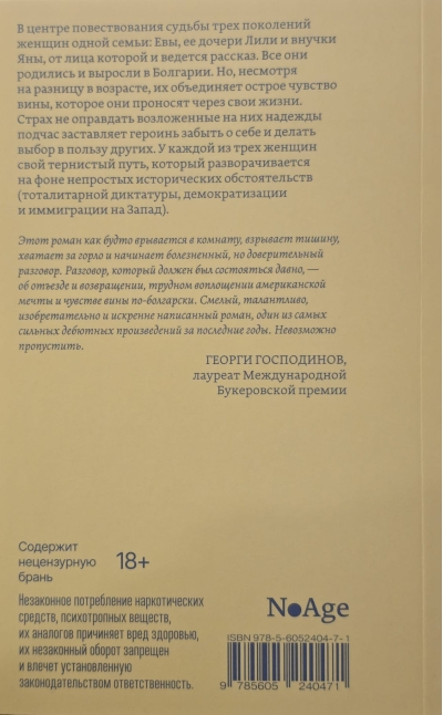 The story centers on the lives of three generations of women from one family: Eva, her daughter Lily, and her granddaughter Yana, who is the narrator. All were born and raised in Bulgaria. But despite their age differences, they are united by a profound sense of guilt that they carry throughout their lives. The fear of failing to live up to the expectations placed on them often forces the heroines to forget themselves and choose others. Each of the three women has her own thorny path, unfolding against the backdrop of complex historical circumstances (totalitarian dictatorship, democratization, and immigration to the West).