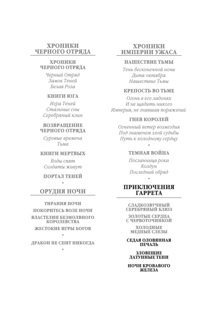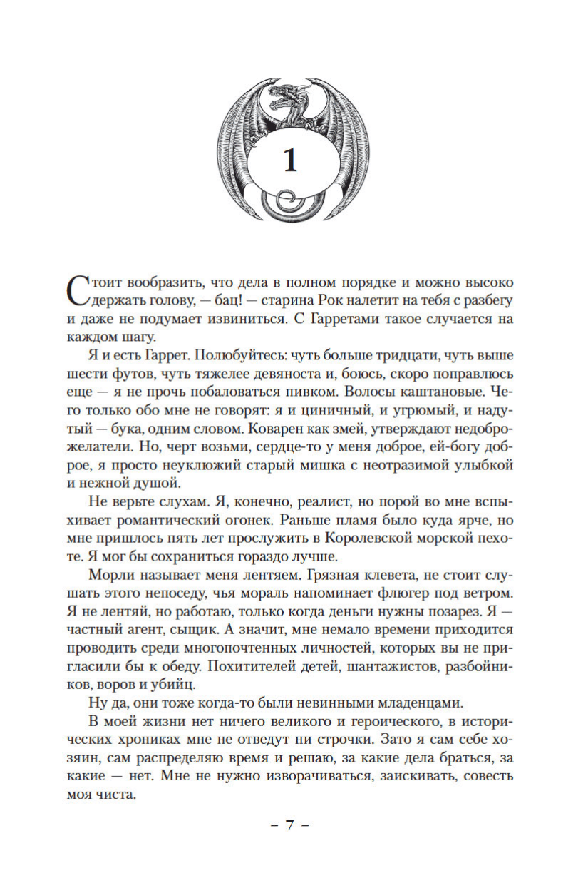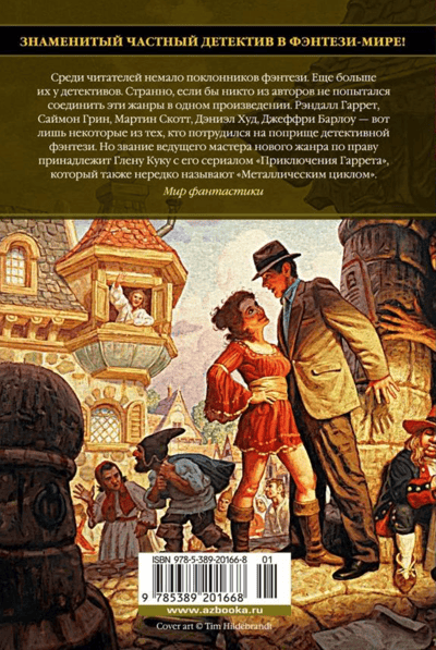 In the magical city of Tanfer, Garrett is the best private investigator, certain to find whoever he seeks, be it an elf, a troll, or a sorcerer. Garrett specializes in paranormal investigations. In the novel "Grey Tin Sorrow," he undertakes to uncover who is trying to hasten the death of a wealthy elderly general, but soon discovers that the crime victim has a chance of outliving her potential heirs. In "Evil Brass Shadows," he finds himself caught in a whirlwind of events sparked by the theft of the Book of Visions from a sorceress named Snake. In "Nights of Blood Iron," he sets out to hunt a serial killer who, for some reason, only kills young, black-haired aristocratic women.