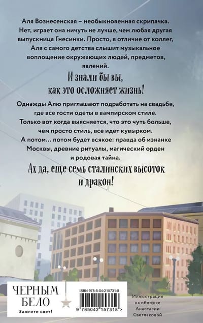 One day, Alya is invited to work part-time at a wedding where all the guests are dressed in vampire style. But when it turns out that this is a little more than just a style, everything goes topsy-turvy. And then... then there will be all sorts of things: the truth about the seamy side of Moscow, ancient rituals, a magical order, and a family secret. Oh yeah, and Stalin's seven skyscrapers and a dragon!