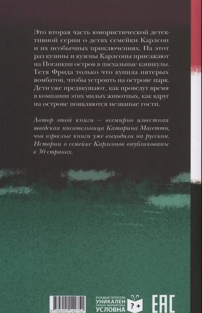 This is the second part of the humorous detective series about the children of the Carlson family and their unusual adventures. This time, Carlson’s cousins and cousins come to Pogankin Island for the Easter holidays. Aunt Frida just bought five wombats to set up a park on the island. Children are already looking forward to spending time in the company of these cute animals, when suddenly uninvited guests appear on the island.