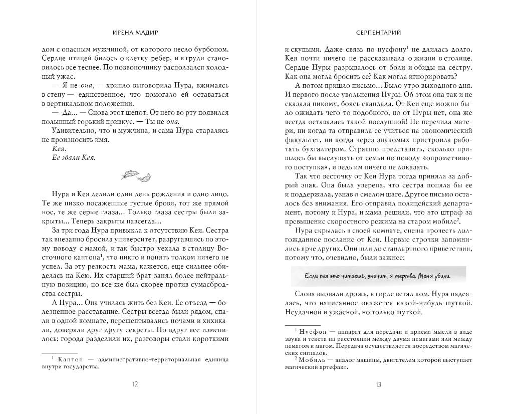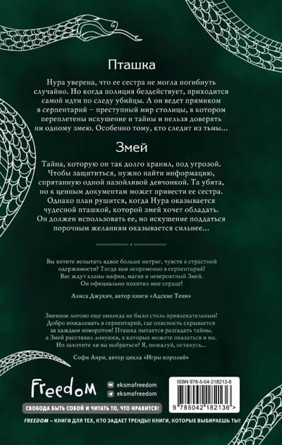 The main character dives into the dangerous criminal world of snake clans to unravel the mystery of her sister's death. However, this Birdie does not know that the most dangerous Serpent of the Serpentarium has already penetrated her house, and will soon settle in her heart...